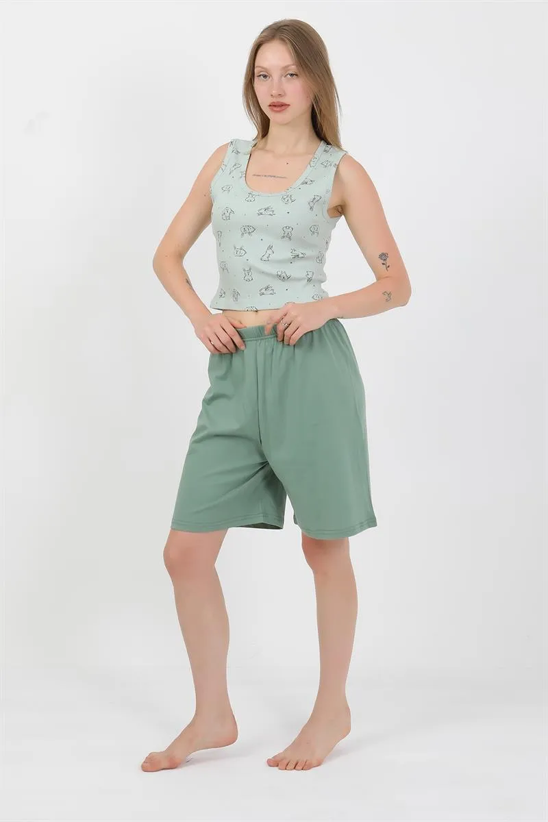 طقم بيجامة نسائية منقوشة بحمالات رفيعة وياقة مربعة مع شورت متناسق. مصنوع من قماش ناعم وقابل للتهوية لراحة وأناقة في الليالي الحارة بالمنزل.