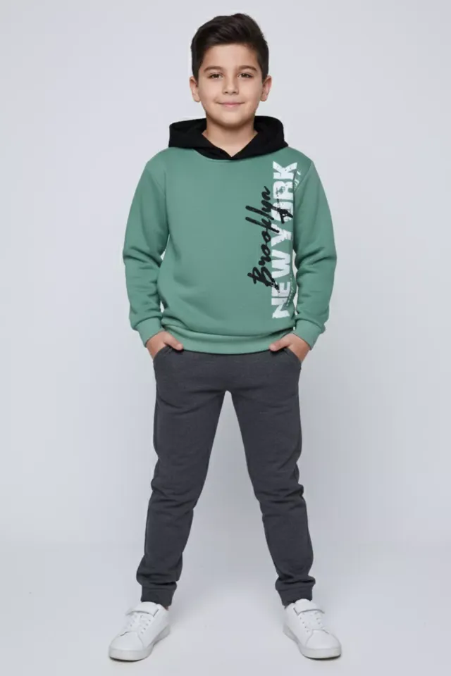 سويت شيرت بغطاء رأس للأولاد مصنوع من مزيج من 50% قطن و50% بوليستر، بتطريز أنيق. يمنح طفلك مظهرًا عصريًا مع ضمان راحة استثنائية طوال اليوم.