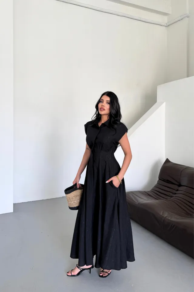 فستان كاجوال بدون أكمام مع أزرار أمامية وفتحة رقبة على شكل حرف V بطيات - Beyond Store