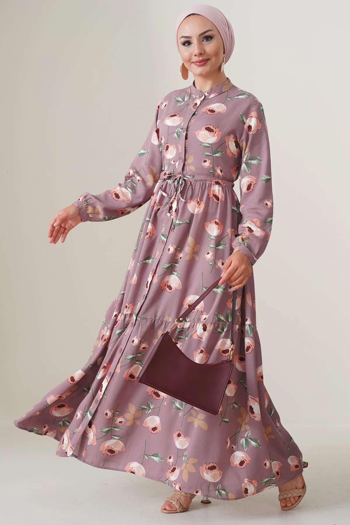 فستان طويل منقوش بأكمام طويلة ومزين بطيات وياقة دائرية من الشيفون