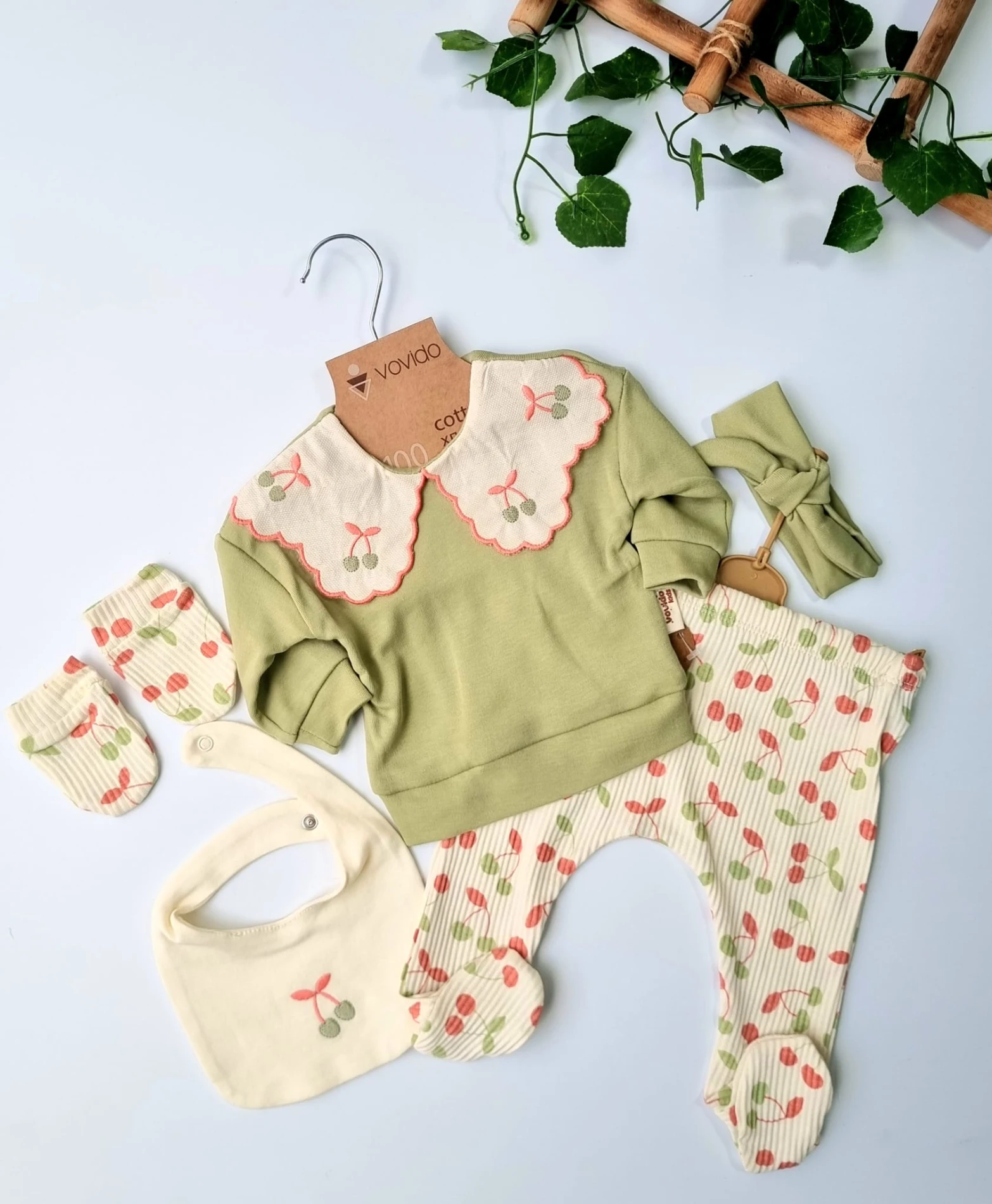 طقم أفرول و ربطة رأس موحد اللون بقصّة عادية مزينة بكشكش للبنات الرضع