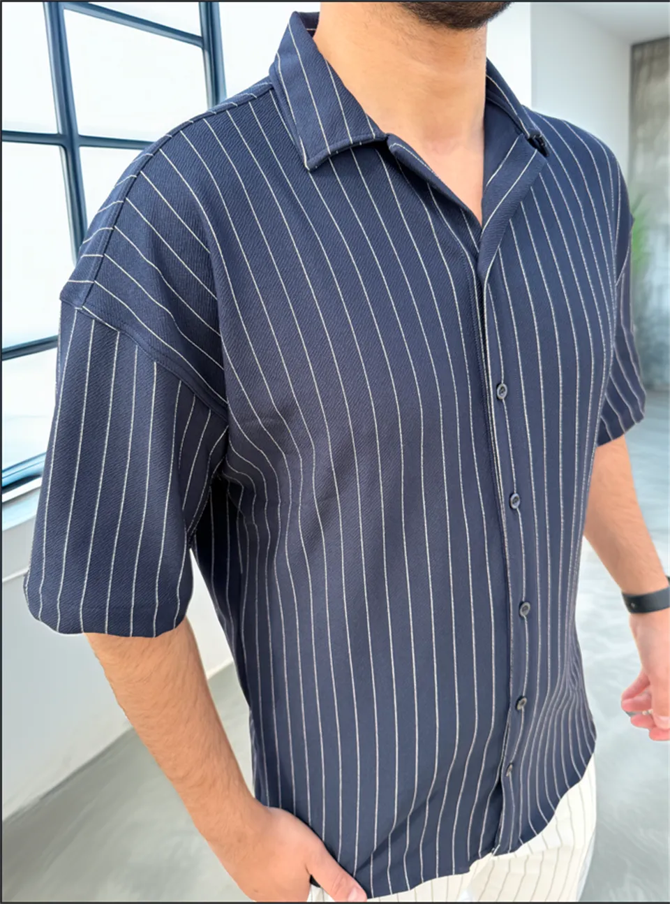 قميص منسوج بأزرار أمامية وقصة مريحة بتفاصيل مجعدة - Beyond Store