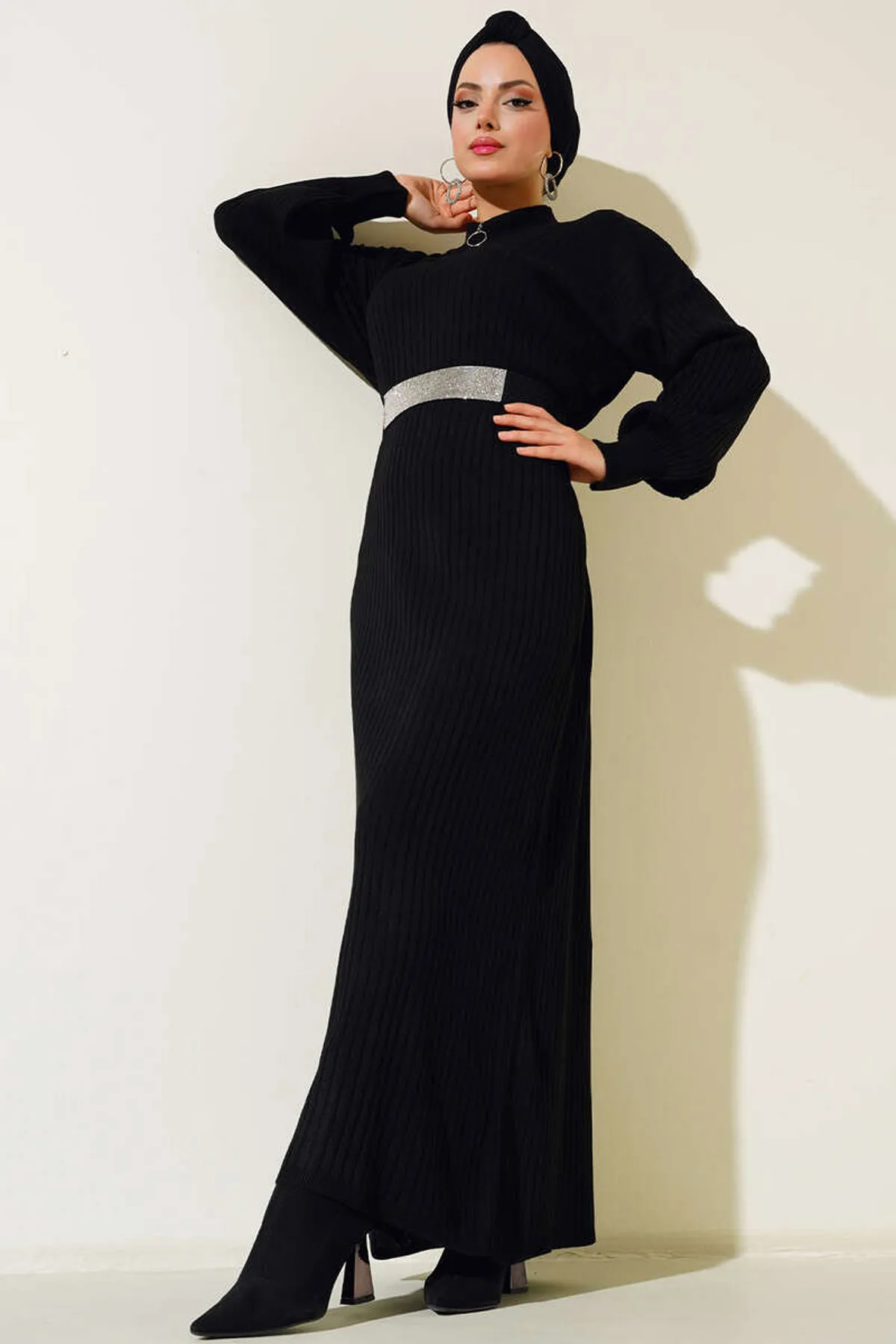 مقاسات الموديل: الطول: 176 سم، الصدر: 90 سم، الخصر: 63 سم، الوركين: 94 سم