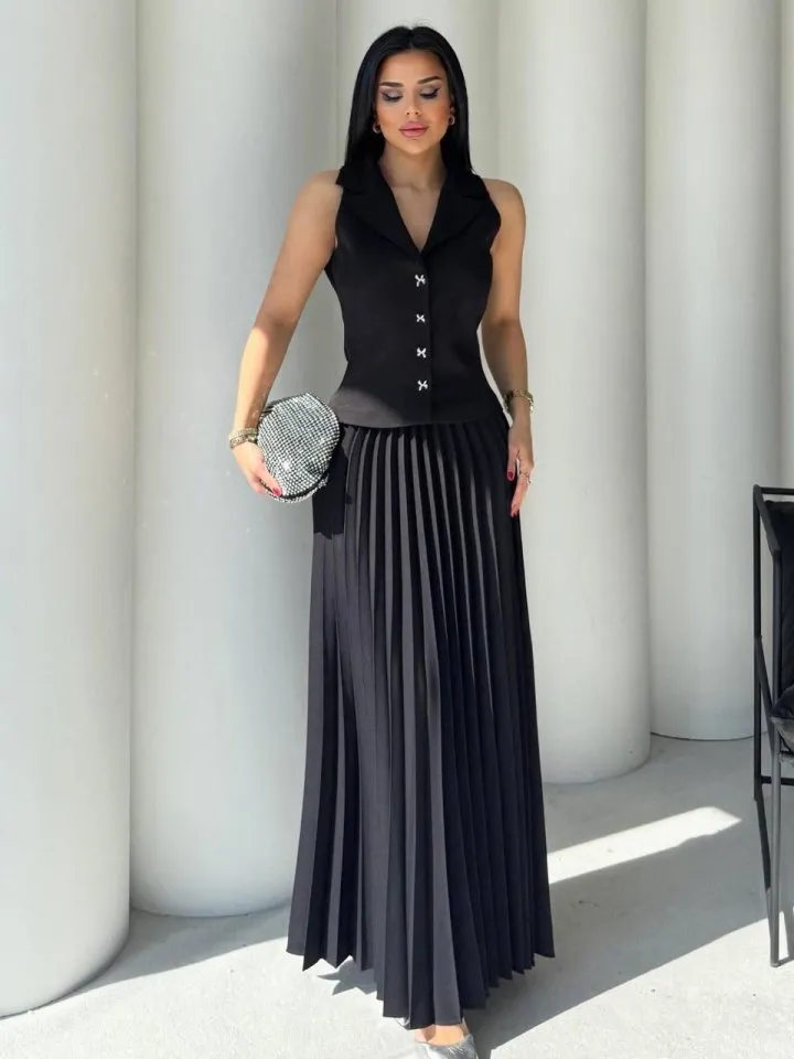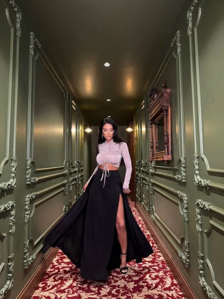 مقاسات الموديل: الارتفاع: 176 سم، الصدر: 90 سم، الخصر: 63 سم، الوركين: 94 سم