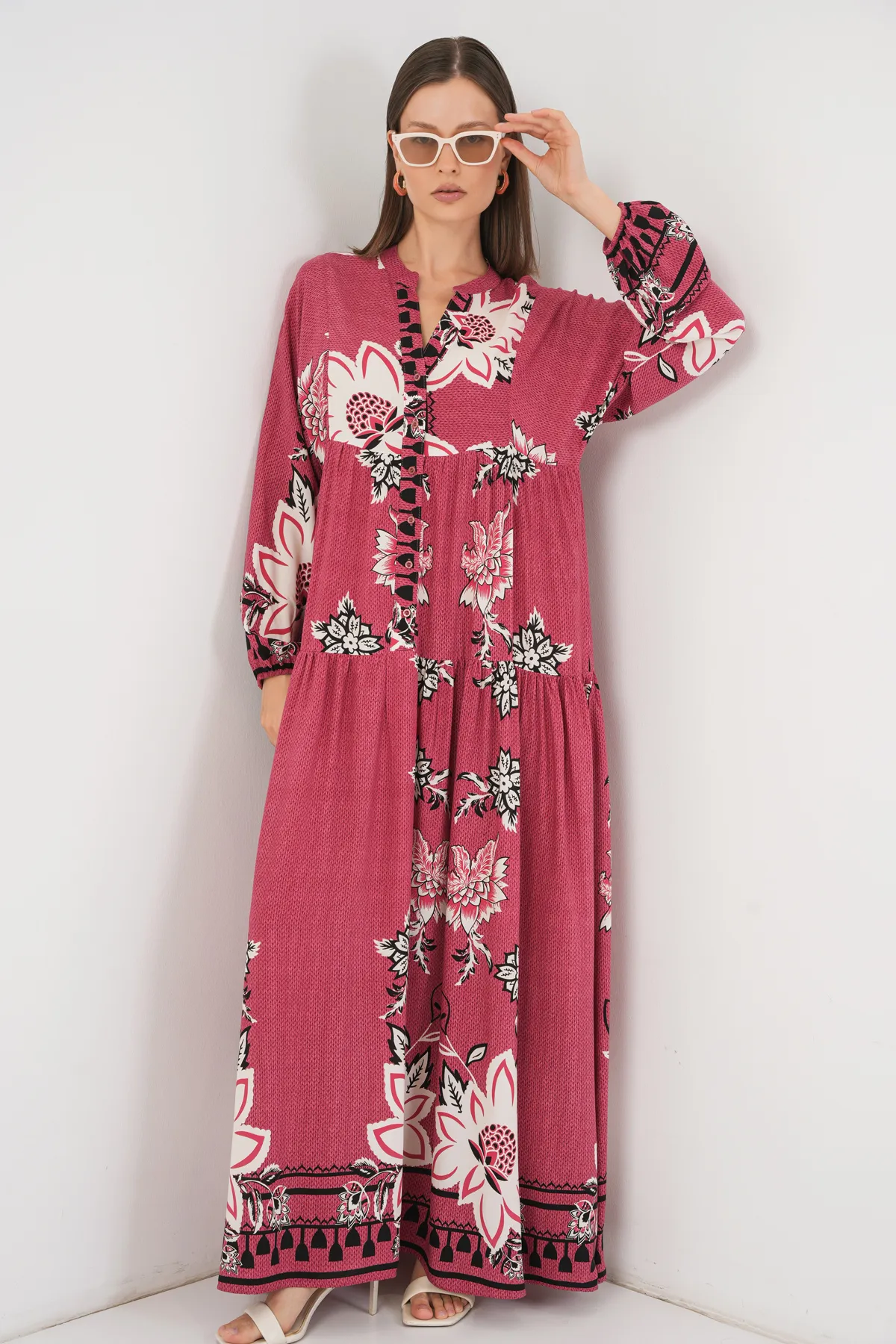 فستان نسائي منقوش بأزرار أمامية وياقة قائمة