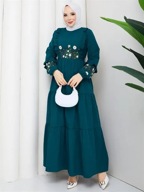 هذا الفستان صمم عشانك لو تبين إطلالة محتشمة بس فيها أناقة. واسع، ناعم، ونقشته ملفتة بشكل بسيط وأنيق.