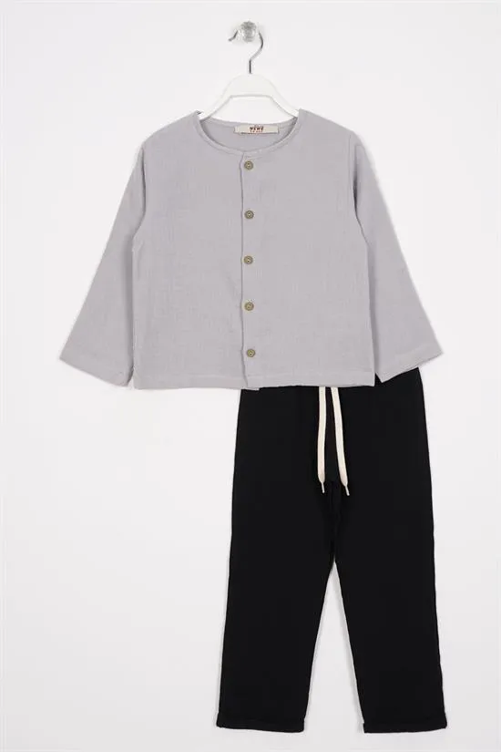 هذا الطقم مصنوع من قماش قطني أسود عالي الجودة، مكون من تيشيرت بطبعة أمامية فريدة وأكمام مخططة. تم تصميم البنطلون بقصّة فضفاضة مريحة وجيب أمامي. مجموعة من قطعتين، مثالية للأولاد الذين يستمتعون بالأناقة والراحة. مصنوعة من القطن بنسبة 100%.