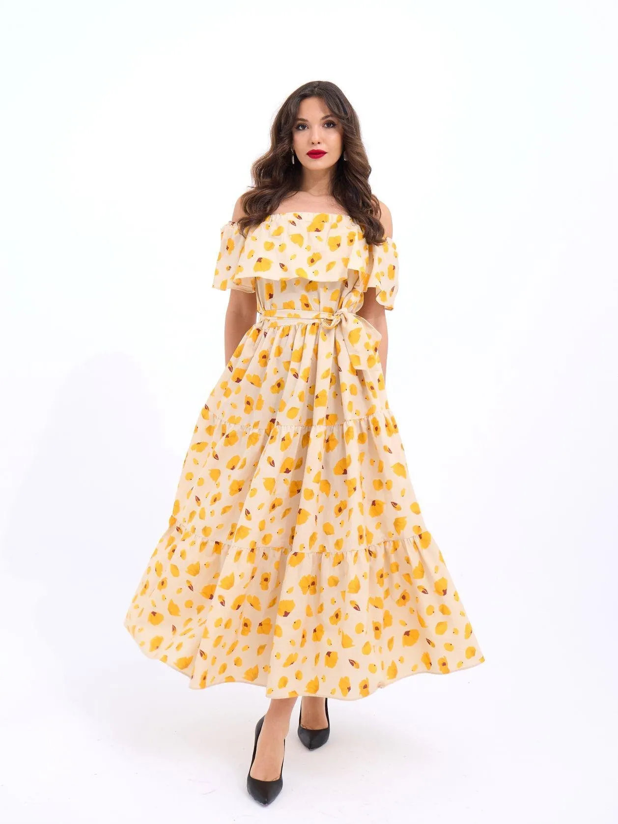 مقاسات الموديل: الطول: 176 سم، الصدر: 90 سم، الخصر: 63 سم، الوركين: 94 سم