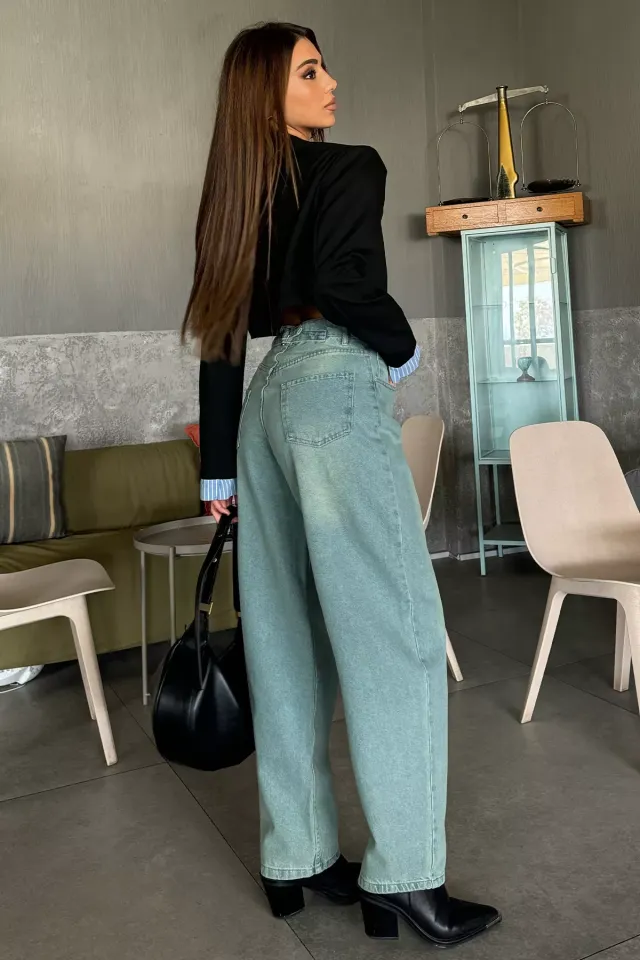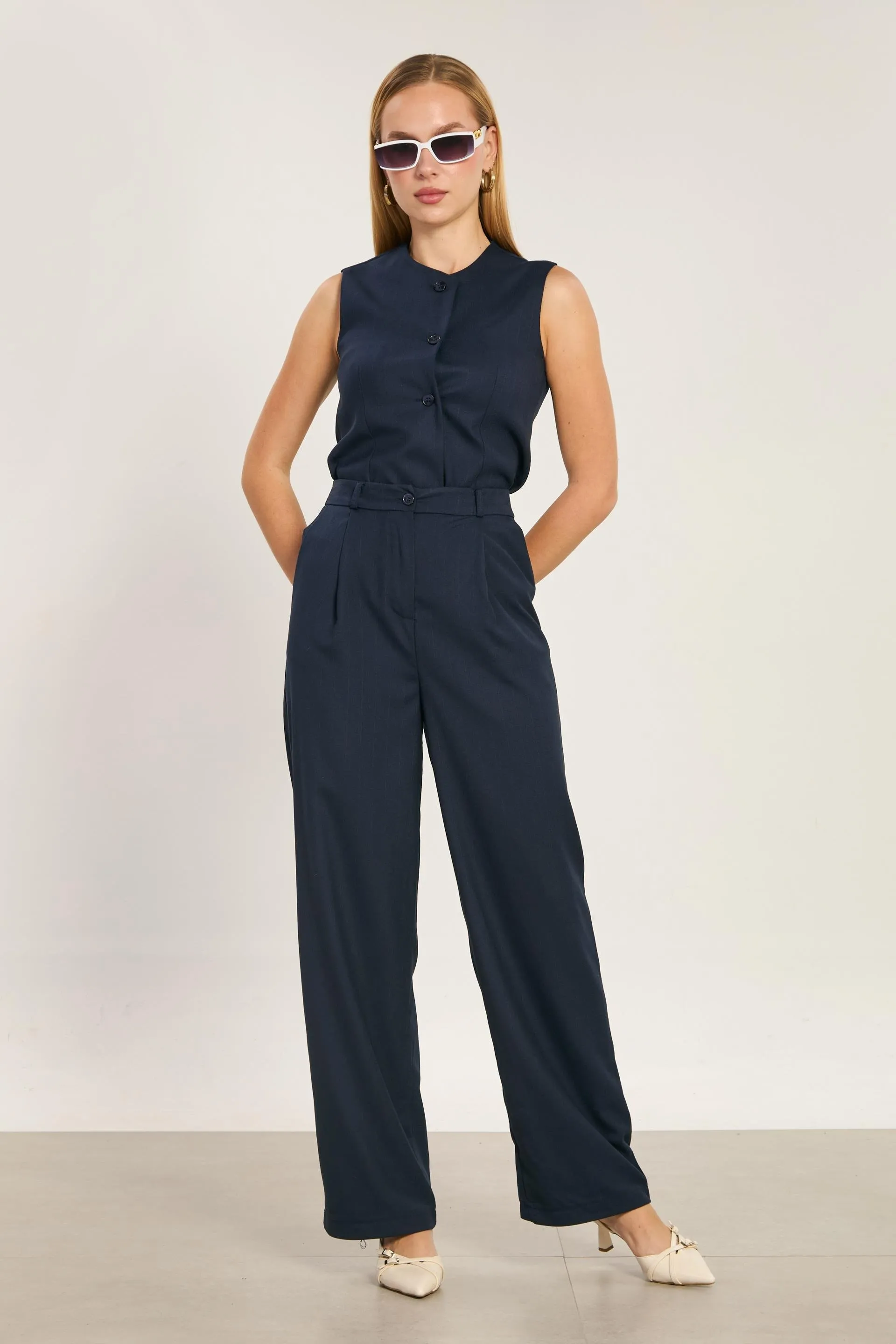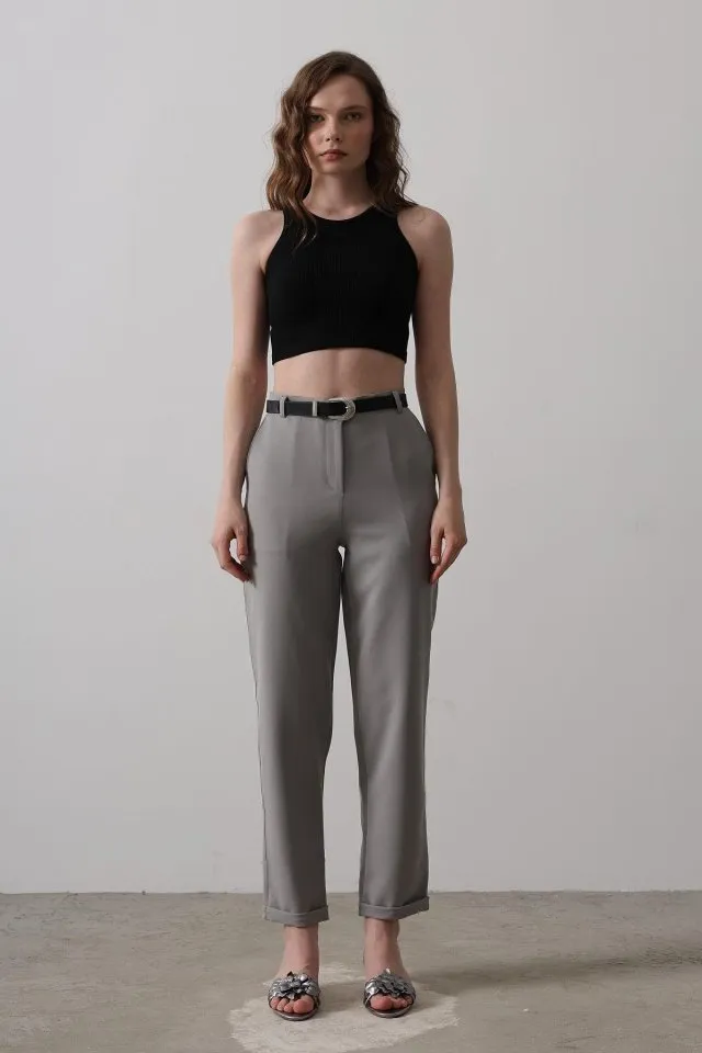 بنطال بخصر مرتفع وحزام وقصة مستقيمة من قماش متماسك. مثالي لإطلالات واضحة الملامح في يومك العملي.
