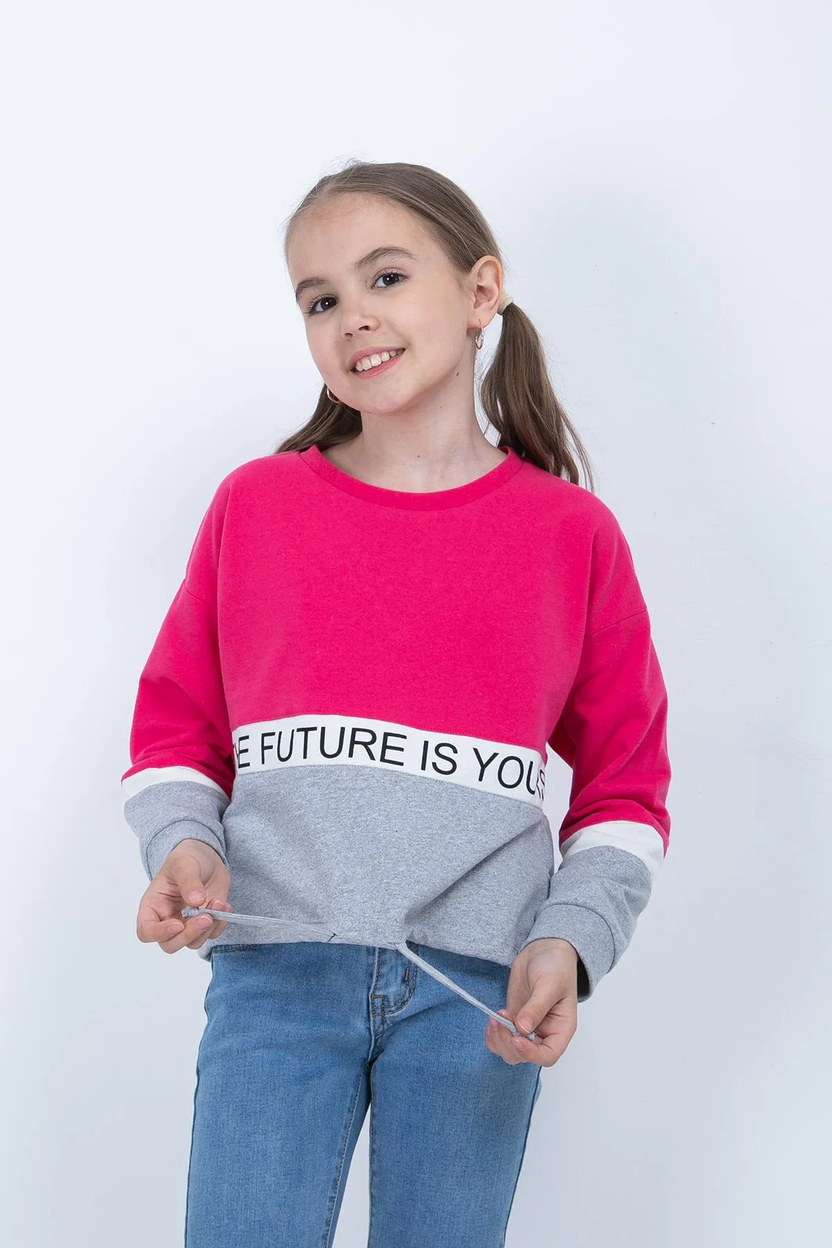 سويت شيرت بناتي بياقة دائرية مصنوع من قماش ثنائي الخيط الناعم.