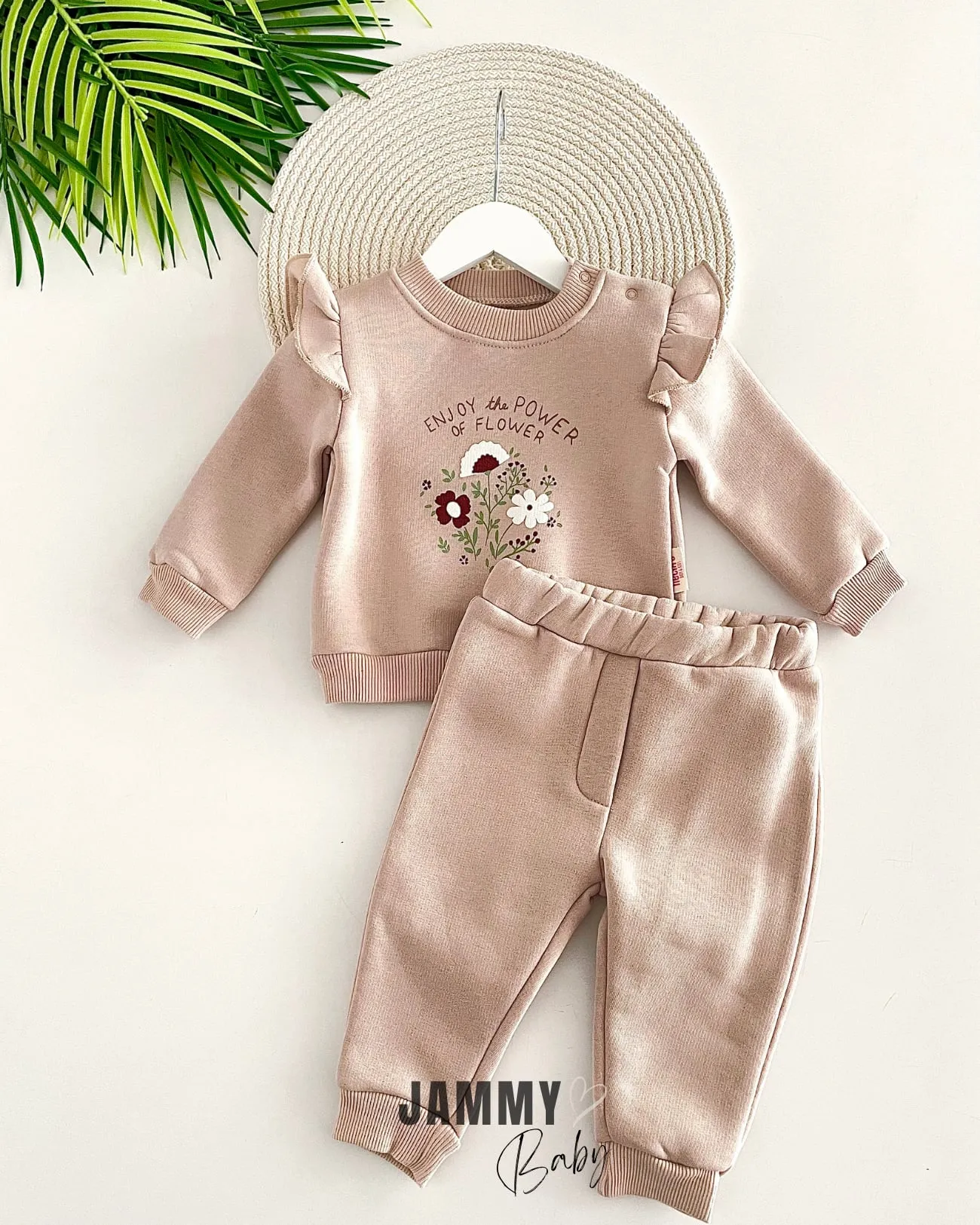 طقم للبنات الصغار مصنوع من قماش 97% قطن و3% ليكرا، مع طباعة على الجهة الأمامية، مما يجعلها مريحة وأنيقة للطفل.