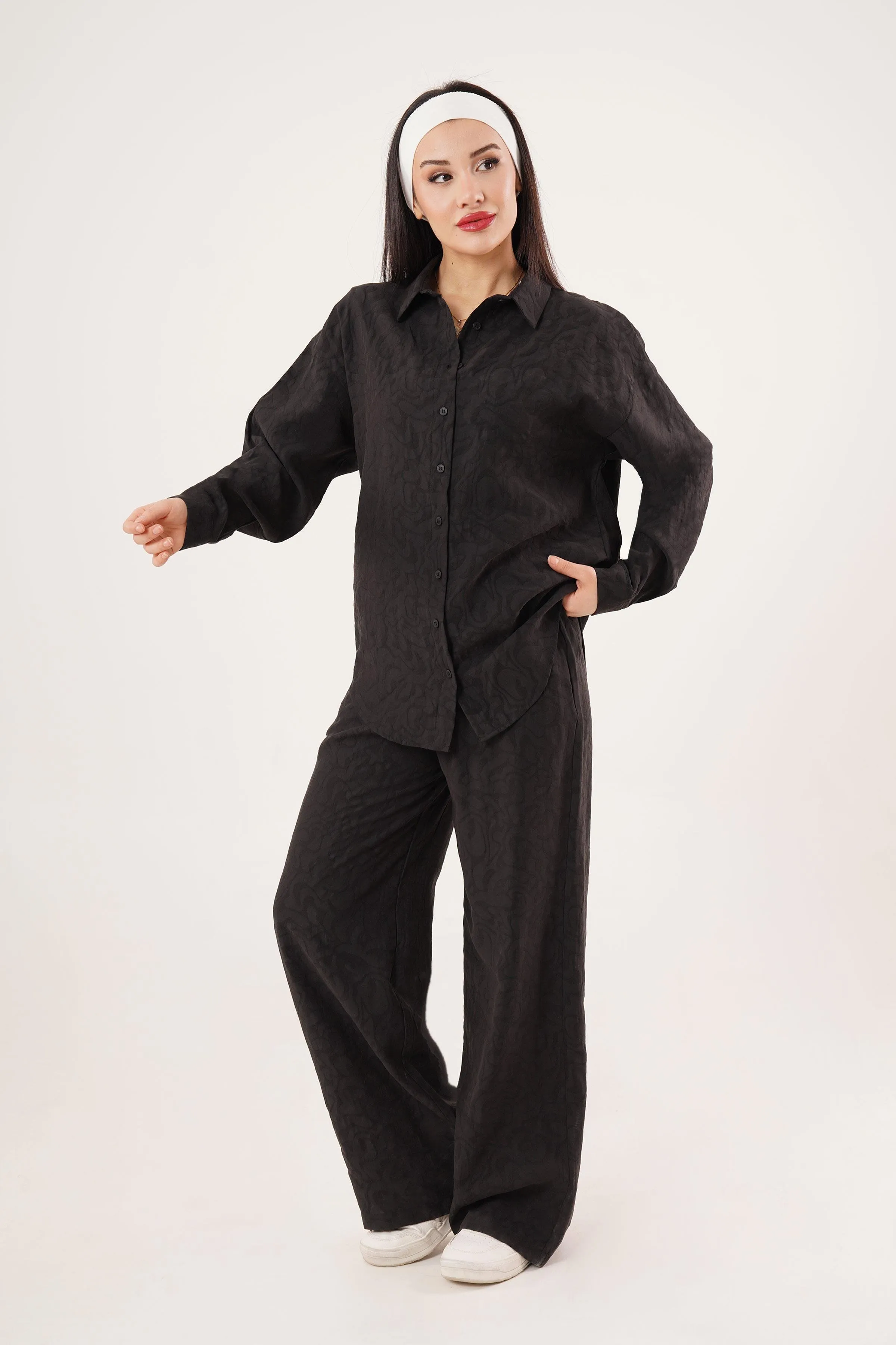طقم مكون من بلوزة قصيرة بأكمام طويلة وبنطلون واسع الساق للنساء - Beyond Store