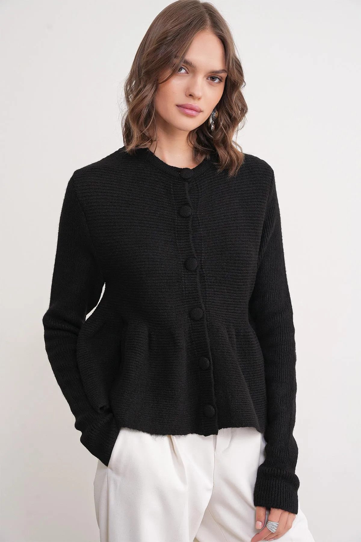 سترة نسائية ذات تفاصيل لؤلؤية بقصة مريحة وياقة دائرية - Beyond Store