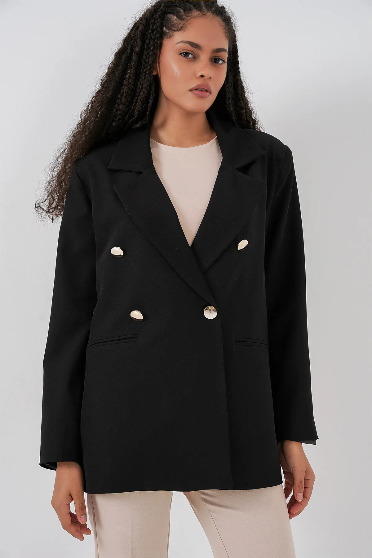 مصنوع من 100% بوليستر، يتميز هذا الجاكيت بمرز بمرز يناسب الجسم بشكل مريح. الموديل يرتدي المقاس 38، وقياساته: الطول: 176 سم، الصدر: 90 سم، الخصر: 63 سم، الورك: 94 سم. طول المنتج: 64.8 سم، طول الكم: 52 سم.