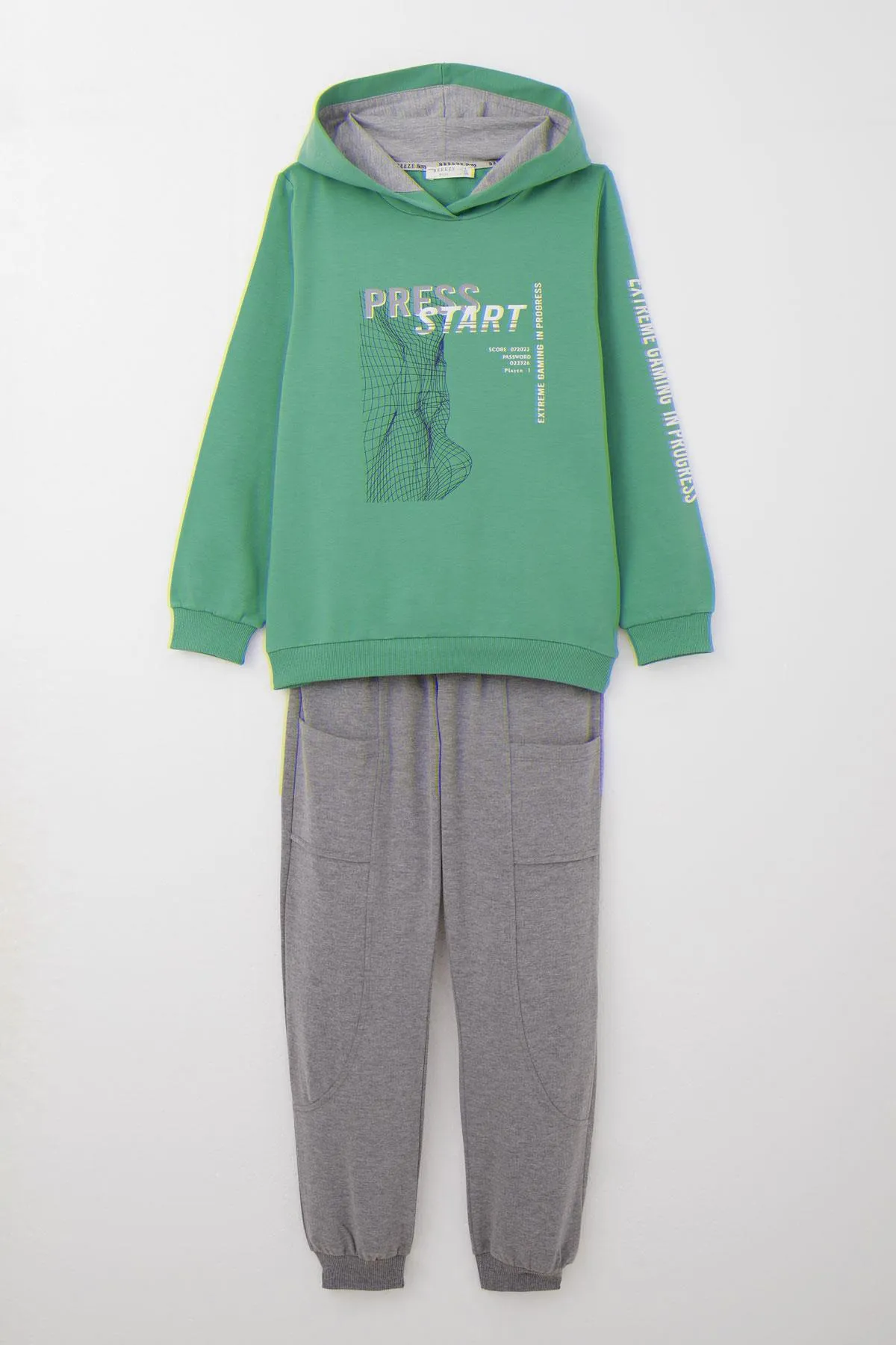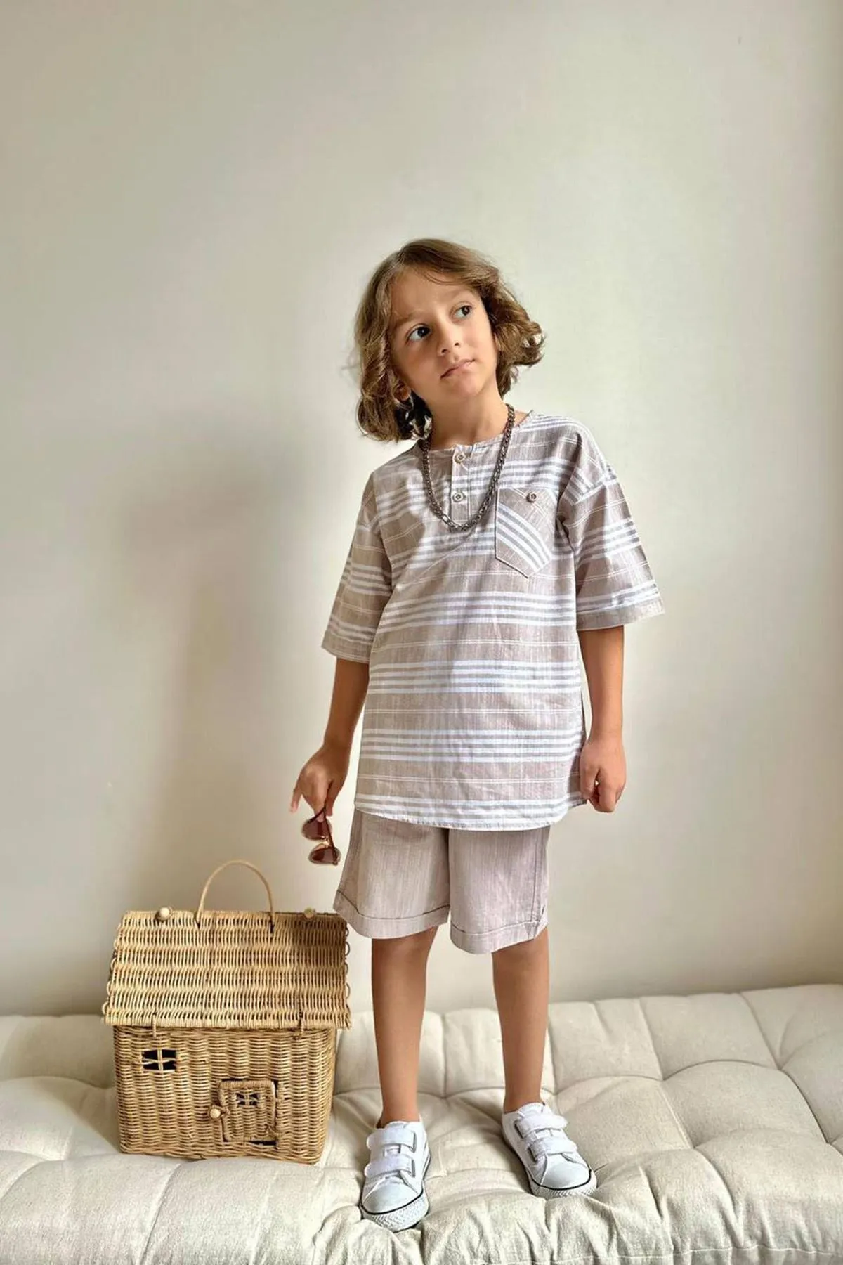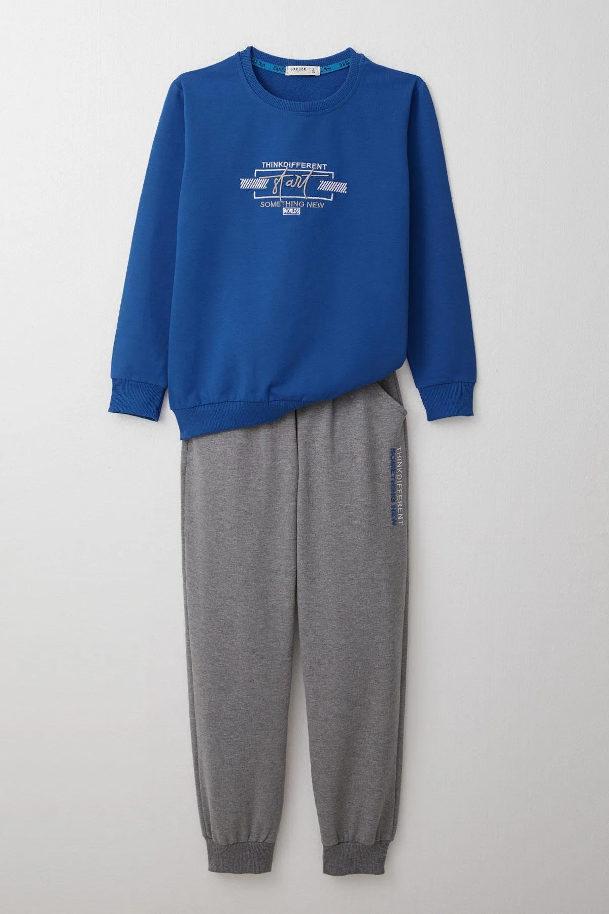 طقم كاجوال مريح للأولاد يتميز بتيشيرت بياقة دائرية وتصميم مطبوع مرح، مصنوع من قطن ناعم 100% لراحة فائقة وتهوية ممتازة. مع بنطال عملي مصنوع من مزيج متين من 66% قطن و34% بوليستر لمرونة الاستخدام مناسب للارتداء اليومي. مثالي للطقس المعتدل والمغامرات اليومية. قابل للغسل في الغسالة على درجة حرارة 30 درجة مئوية.