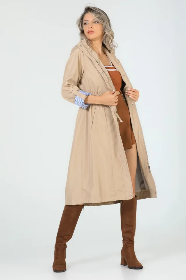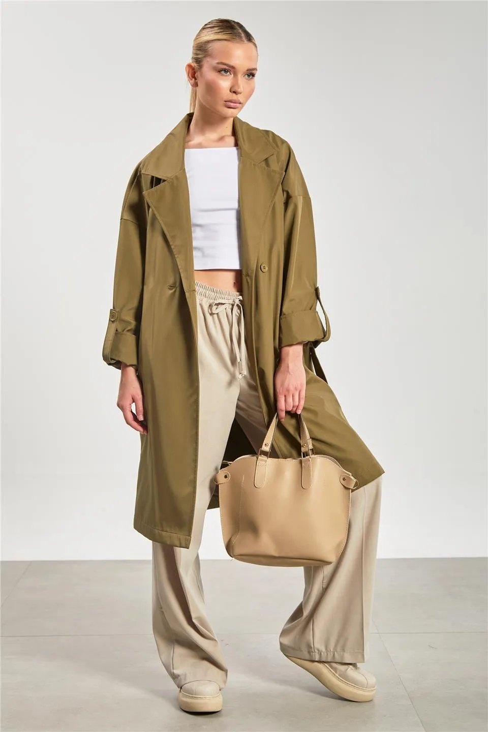 مصنوع من 100% بوليستر، يتميز هذا الترنشكوت المزدوج الصدر المبطن بالأناقة والراحة. الموديل يرتدي المقاس 38، وقياساته: الطول: 176 سم، الصدر: 90 سم، الخصر: 63 سم، الورك: 94 سم. طول المنتج: 96 سم، طول الكم: 52 سم.