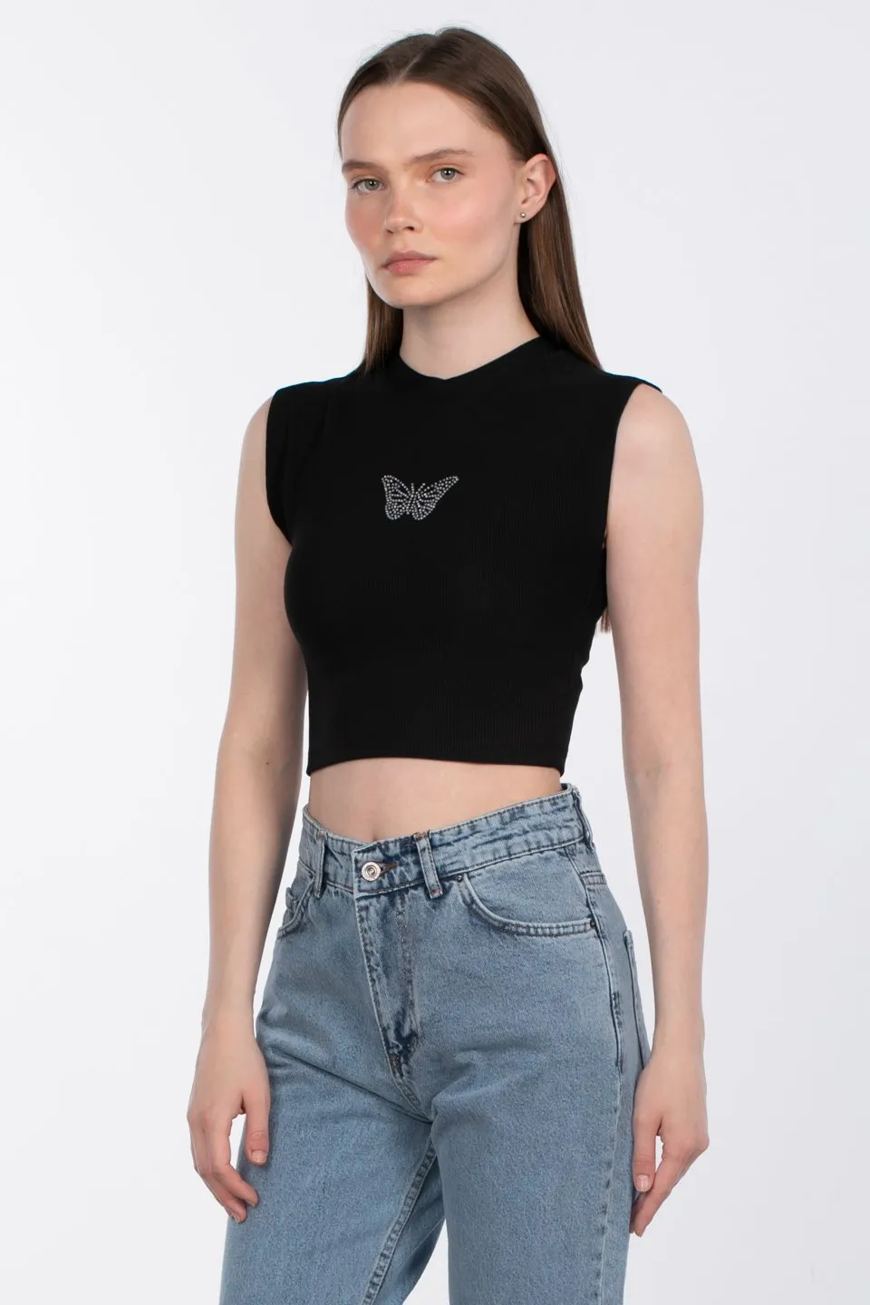 بلوزة قصيرة مضلعة بأكمام قصيرة وياقة نصف مدورة تضفي لمسة أنيقة وعصرية تناسب الطلعات اليومية أو الطبقات المتنوعة.