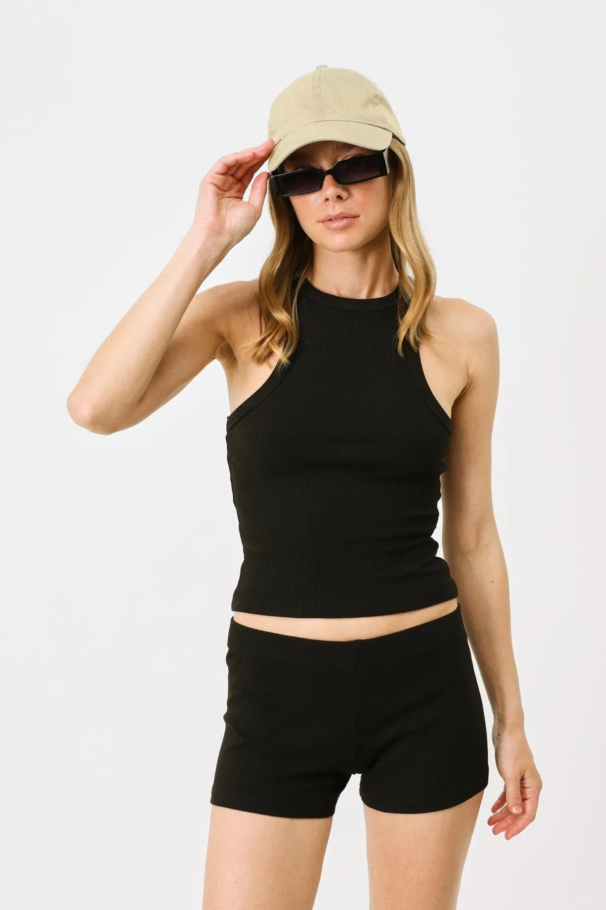بلوزة قصيرة مضلعة بقصة عادية وياقة رَسَن بلون رمادي دخاني تمنحك راحة ومرونة مع لمسة عصرية تناسب الطبقات أو الإطلالات الكاجوال.