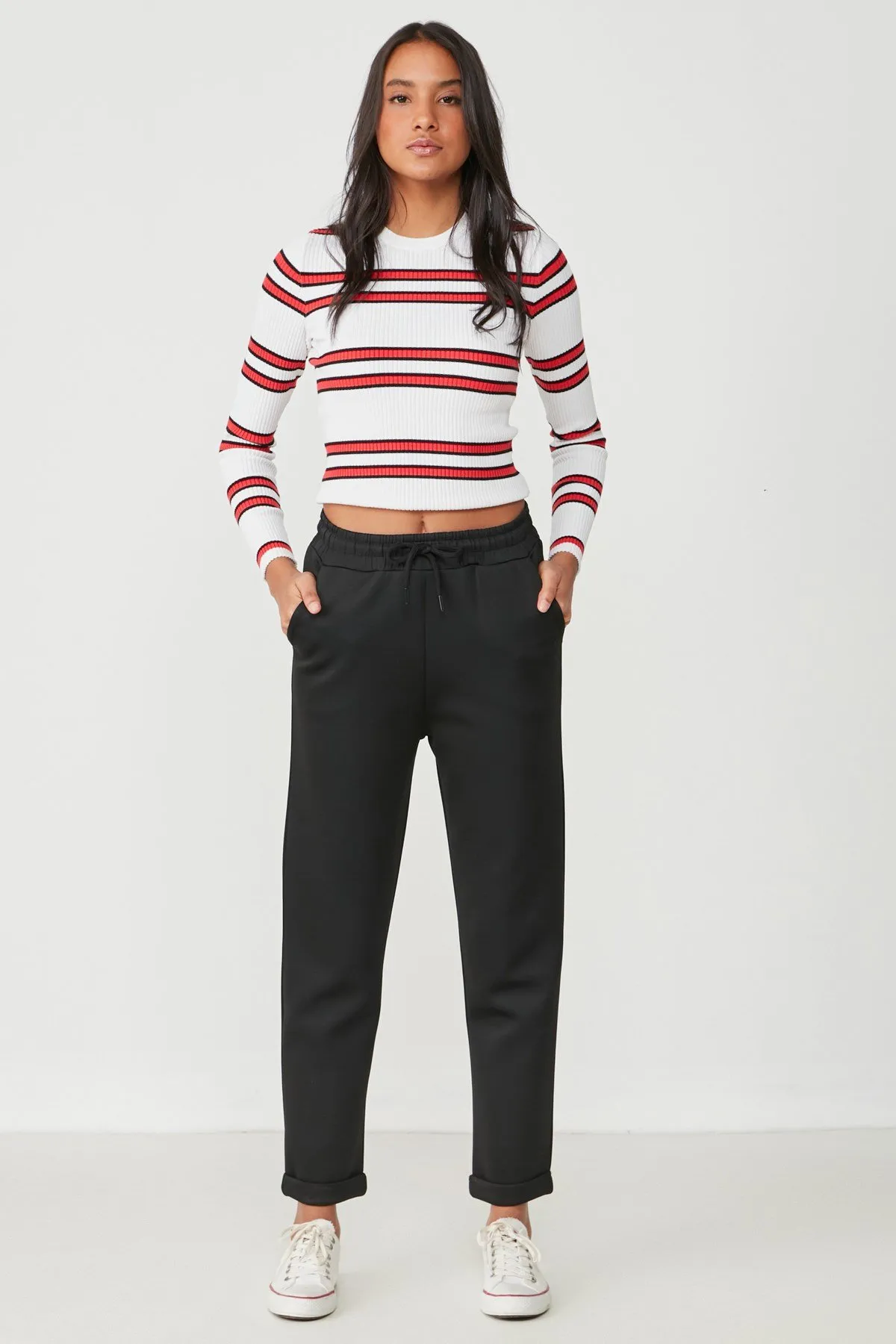 بنطال رياضي واسع الساق بخصر مرتفع، انسيابي ومريح لإطلالة كاجوال ناعمة تجمع بين الراحة والأنوثة.