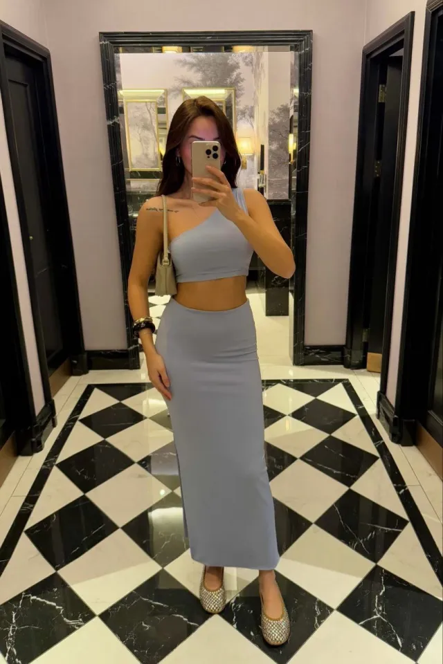 طقم كاجوال منقوش، يتكون من بلوزة بأكمام طويلة وياقة دائرية وتنورة متوسطة الطول. دافئ وأنيق، مثالي لإطلالات يومية مريحة.