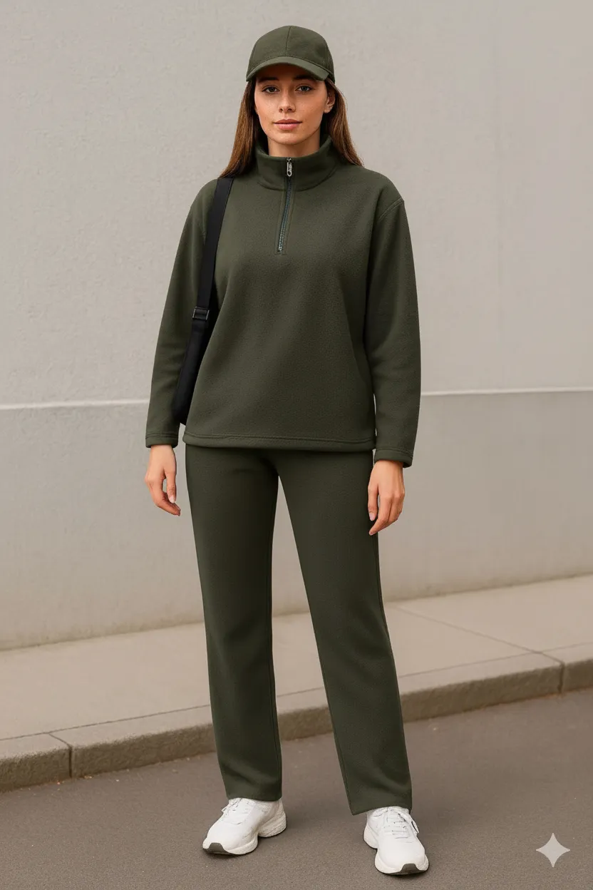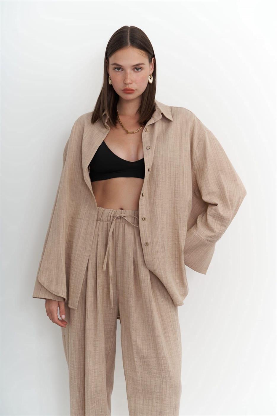 طقم بنطلون كاجوال مع بلوزة بأكمام منسدلة وفتحة رقبة على شكل حرف V. مصنوع من قماش ناعم. مثالي لإطلالة مريحة.