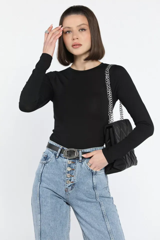 تصميم بأكمام طويلة عادية وياقة دائرية كلاسيكية