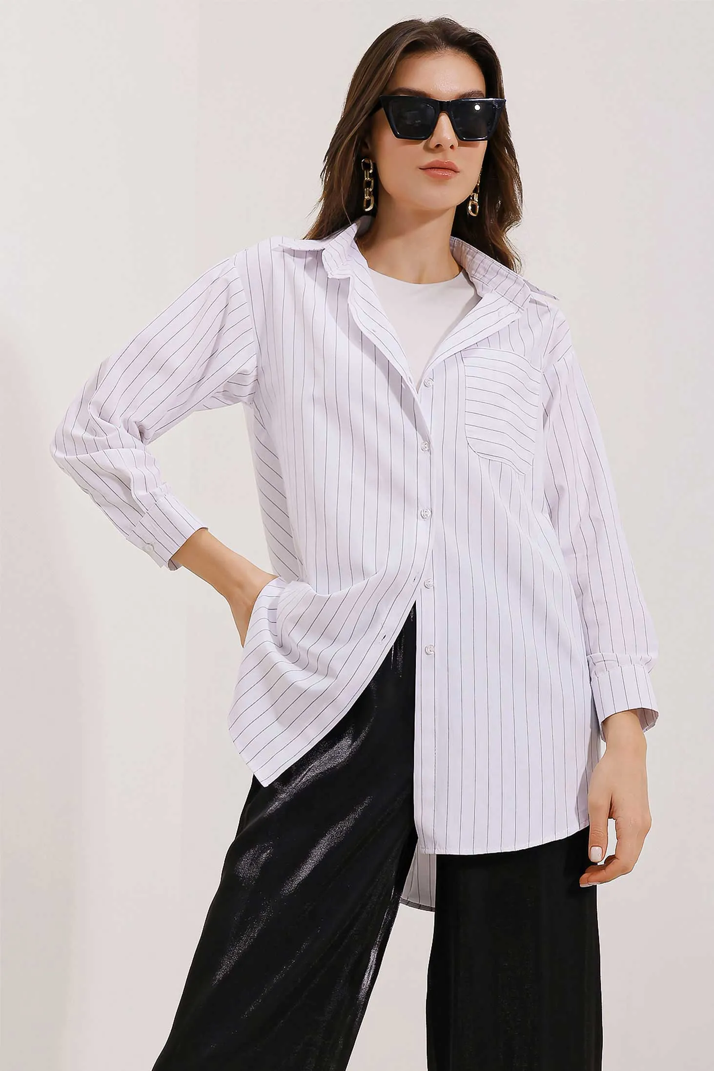 بلوزة كاجوال من قماش فيسكوز بياقة قائمة وتفاصيل أزرار معدنية وياقة V مفتوحة، مثالية لأيام العمل، برانش أنيق، أو إضافة لمسة راقية على إطلالاتك اليومية.