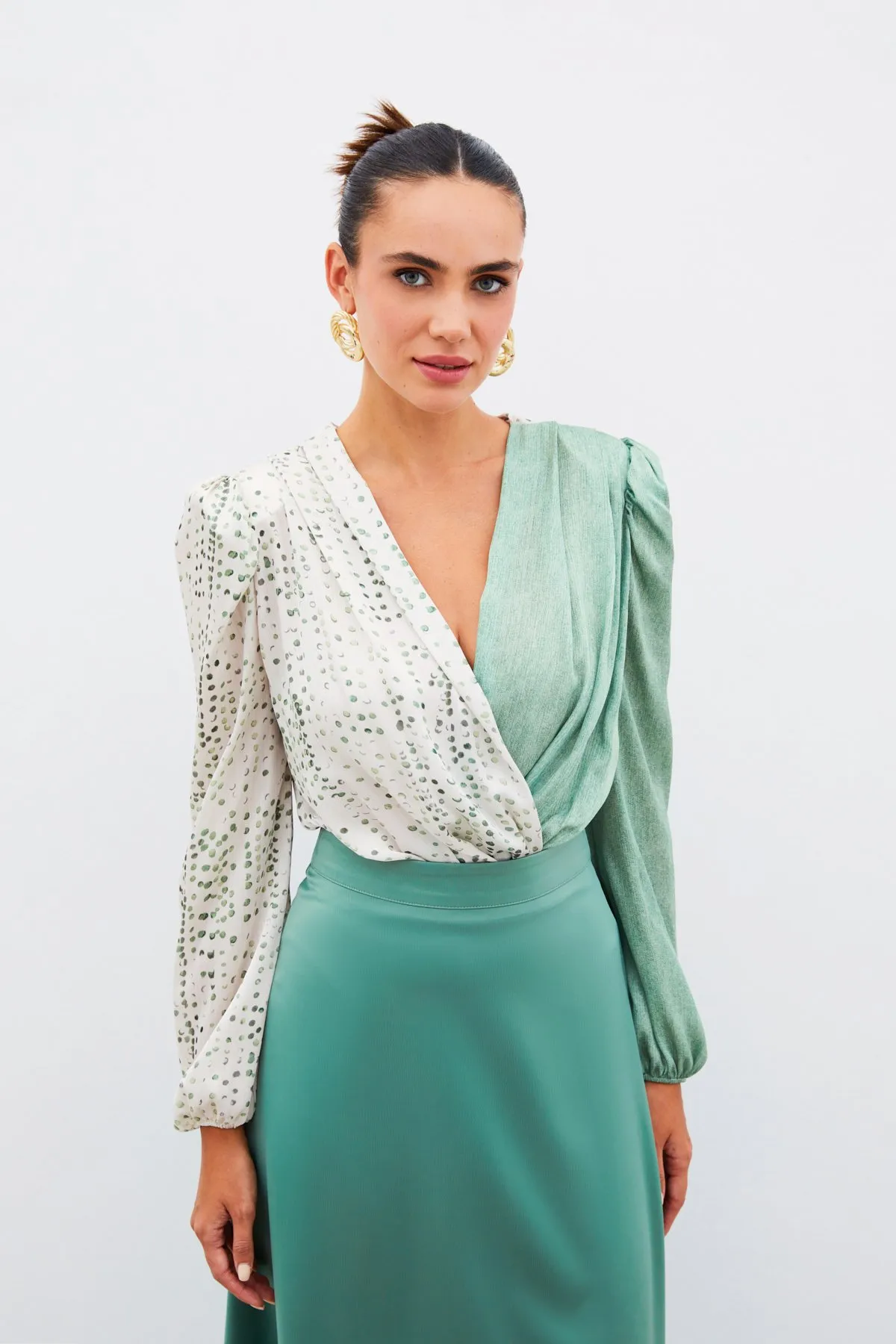 تصميم بأكمام طويلة عادية وياقة قائمة وتفاصيل غير متماثلة
