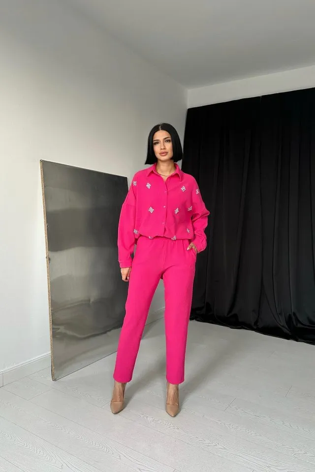 طقم نسائي أنيق، يتكون من جاكيت مخطط بأكمام طويلة وياقة قائمة وأزرار أمامية، مع بنطال كاجوال مصنوع من قماش شاردون ناعم بخيوط مزدوجة. إطلالة عصرية ومريحة، مثالية للارتداء اليومي الأنيق.