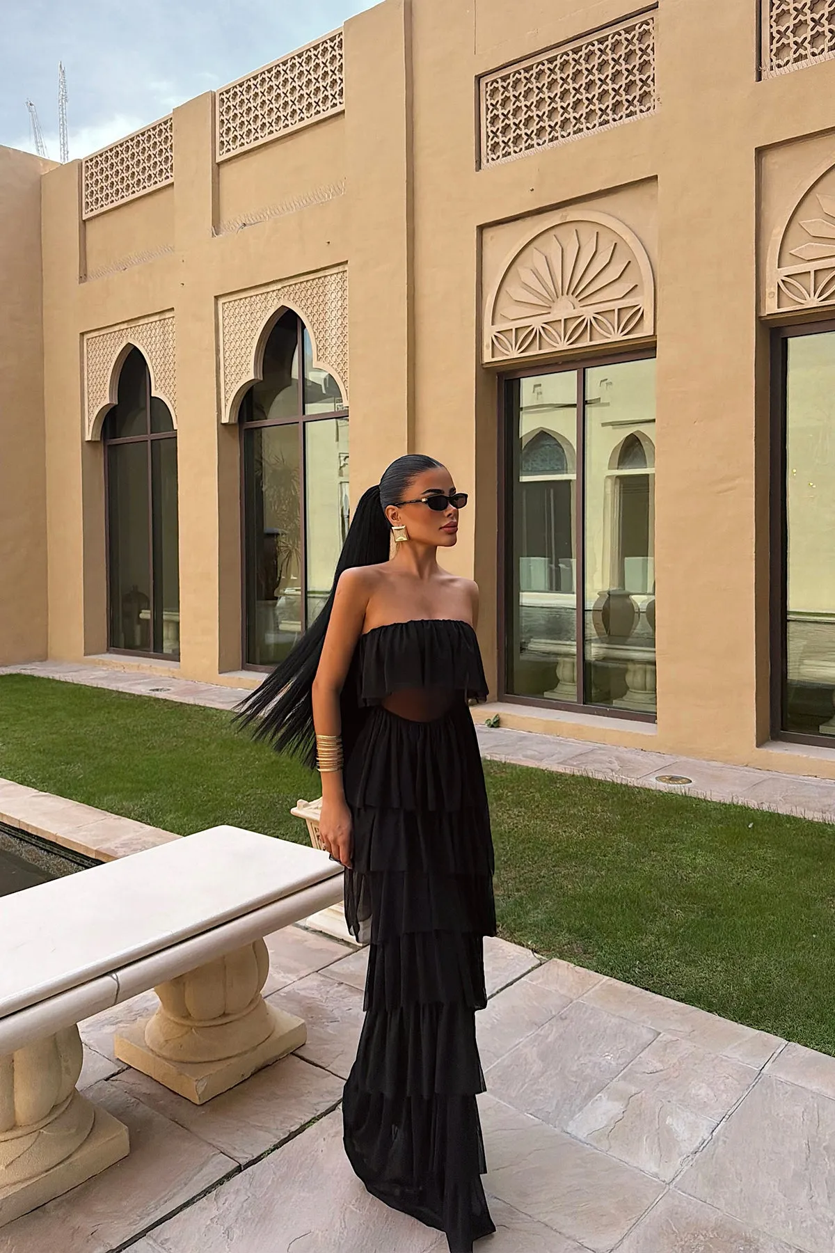 فستان ميدي مضلع بياقة دائرية وأكمام طويلة مزين بتفاصيل أحجار لامعة، خيار أنيق يضفي لمسة بريق راقية لإطلالتك.