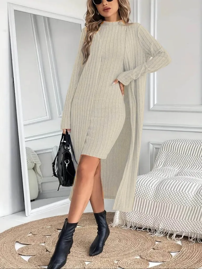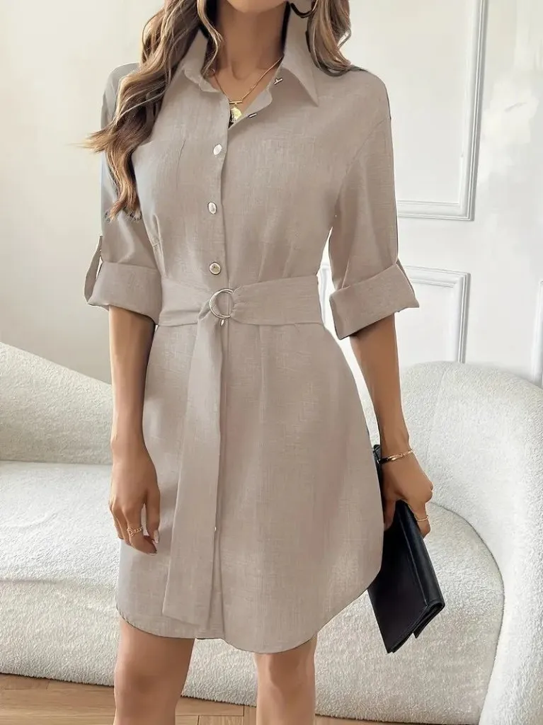 فستان نسائي مضلع متوسط الطول بياقة واسعة وأزرار أمامية، تصميم كلاسيكي مع لمسة عصرية.