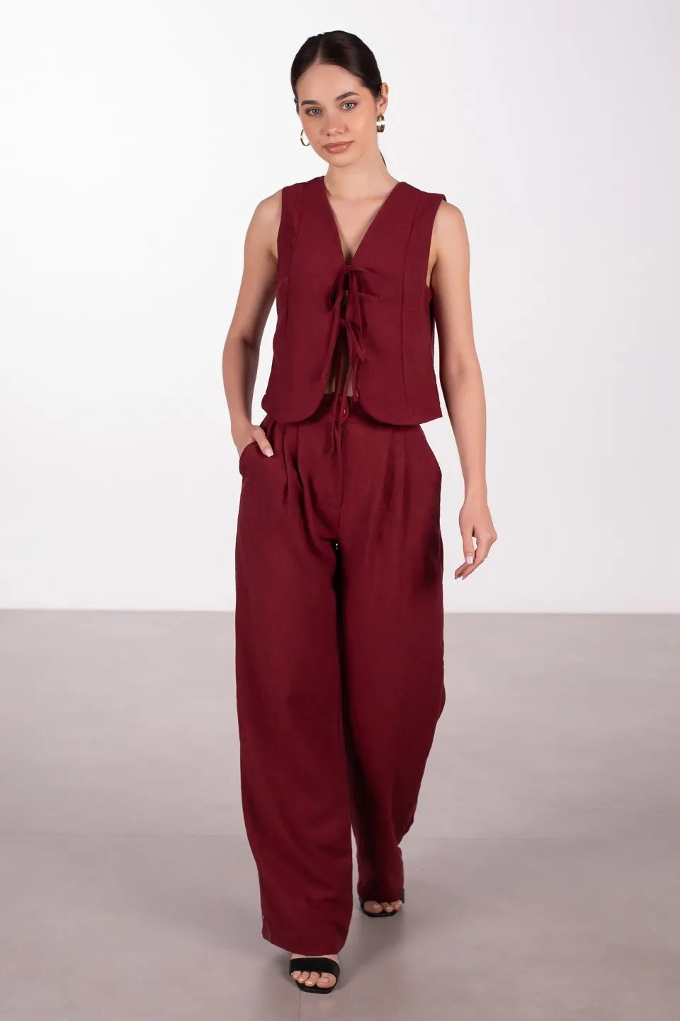 طقم أنيق بقصة منسدلة وتفاصيل مخططة، توب بياقة V وأكمام طويلة مع بنطال بقصة واسعة وفتحة جانبية، مثالي لإطلالة كاجوال مرتبة أو تنسيق مسائي ناعم.