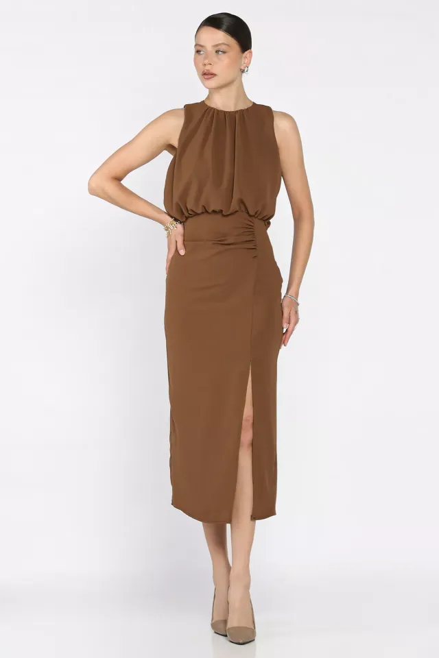 فستان قصير مضلع بياقة دائرية وتصميم كلوش مع تفاصيل طيات، إطلالة شبابية وأنيقة تناسب الأيام الكاجوال.