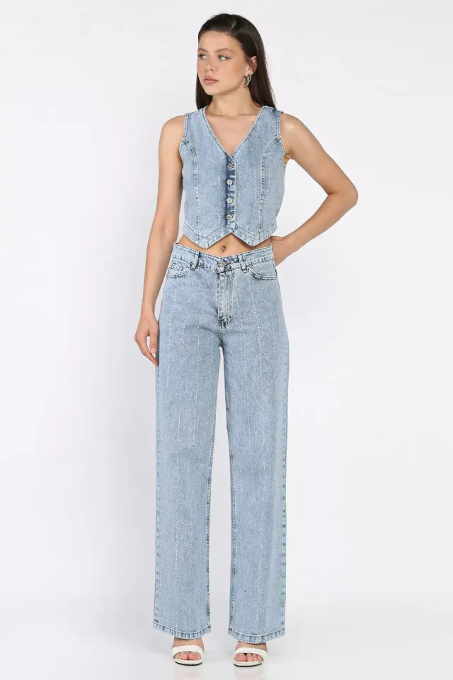 طقم من قطعتين، بنطال بأكمام طويلة وتفاصيل خطوط مضلعة، وبلوزة بياقة على شكل حرف V. قماش ناعم يسمح بمرور الهواء، يضمن الراحة والأناقة.
