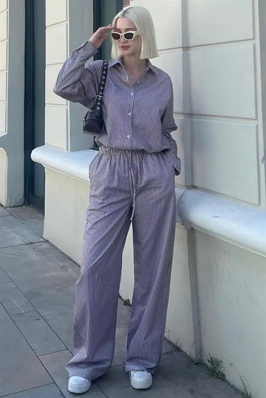 طقم بنطال بأكمام طويلة وتفاصيل مخططة وفتحة رقبة على شكل حرف V