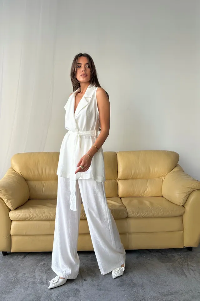 طقم من قطعتين، بنطال بأكمام طويلة وتفاصيل خطوط مضلعة، وبلوزة بياقة على شكل حرف V. قماش ناعم يسمح بمرور الهواء، يضمن الراحة والأناقة.