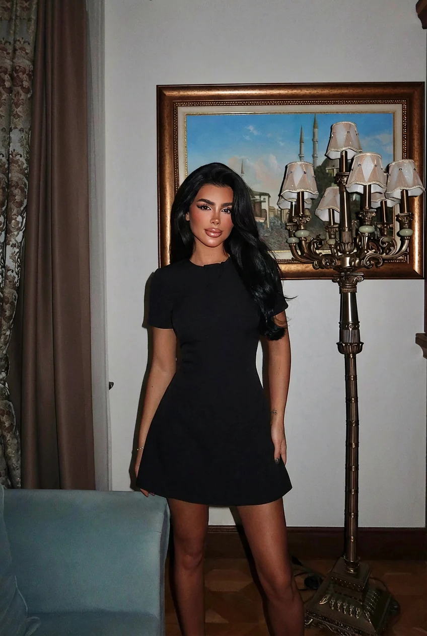 فستان قصير بأكمام شبكية وتصميم صدر مزدوج مزين بأحجار الراين المتلألئة، خيار مثالي للمناسبات الخاصة أو السهرات التي تجمع بين الأناقة والبريق.