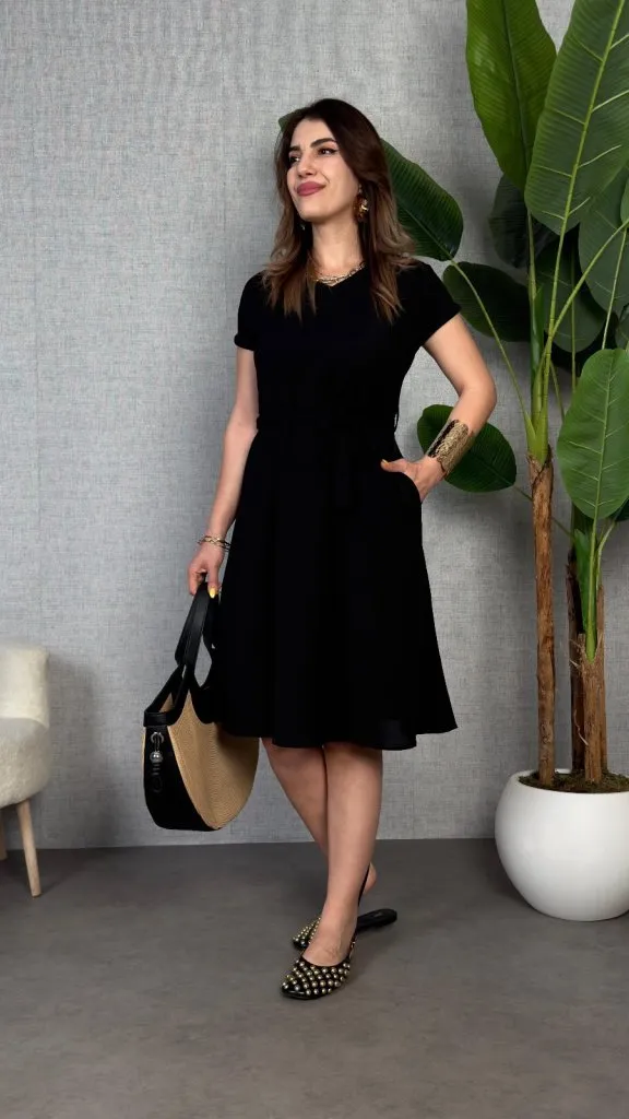 فستان قصير بأكمام طويلة وياقة دائرية مضلعة بلون موحد، تصميم مريح يناسب الطبقات أو الأيام الكاجوال الباردة.