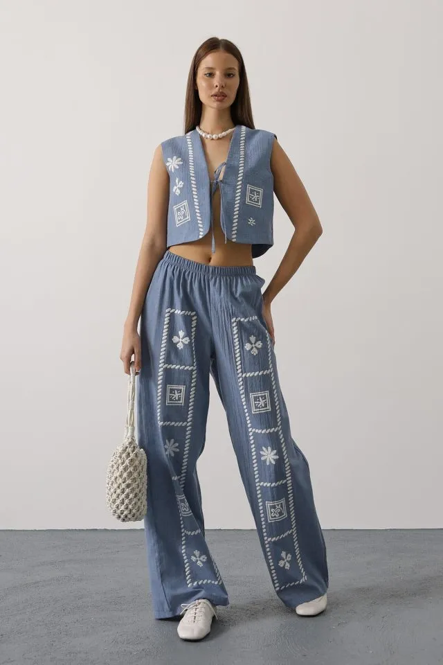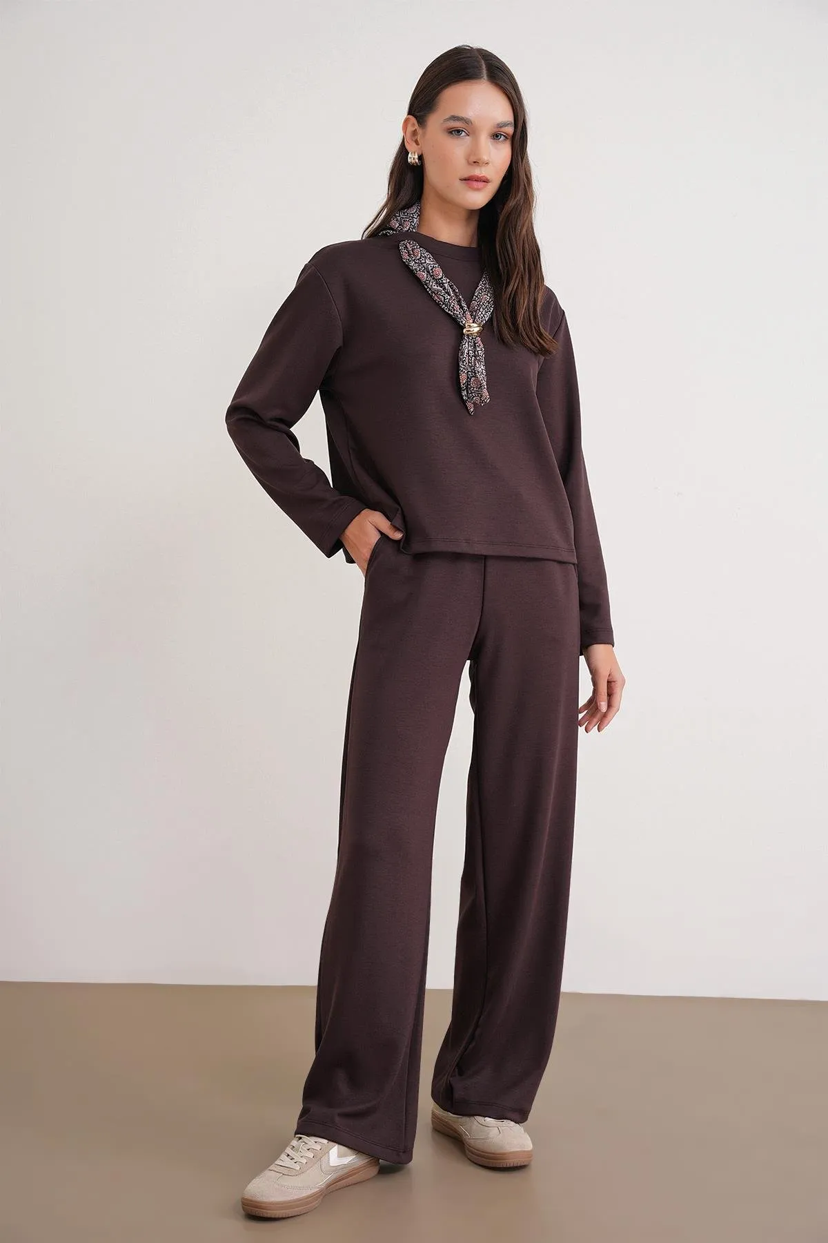طقم نسائي أنيق لموسم الخريف، يتميز ببلوزة بأكمام طويلة وياقة دائرية وتفاصيل شعار أنيقة، مصنوعة من قماش قطني فيسكوز ناعم بخيوط مزدوجة لراحة وأناقة طوال اليوم. مثالية لإطلالات كاجوال أنيقة.