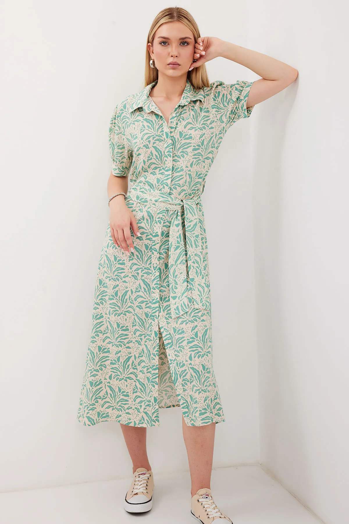 فستان ميدي شيفون بطيات وحزام وياقة V، تصميم أنثوي وناعم لإطلالة ساحرة في المناسبات أو السهرات الخفيفة
