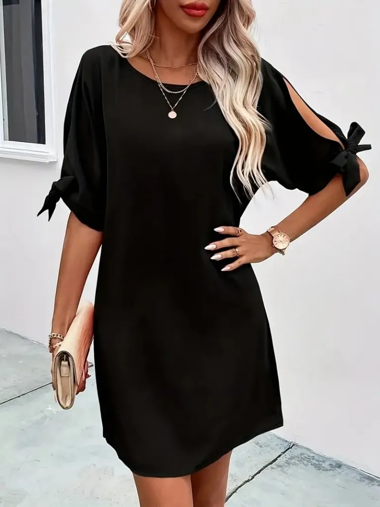 تفاصيل الفتحات مع الياقة الدائرية تضيف لهذا الفستان القصير لمسة عصرية وجذابة، مثالي لسهرات السطح، احتفالات بسيطة، أو أي ليلة تبحثين فيها عن إطلالة جريئة ومميزة بثقة.