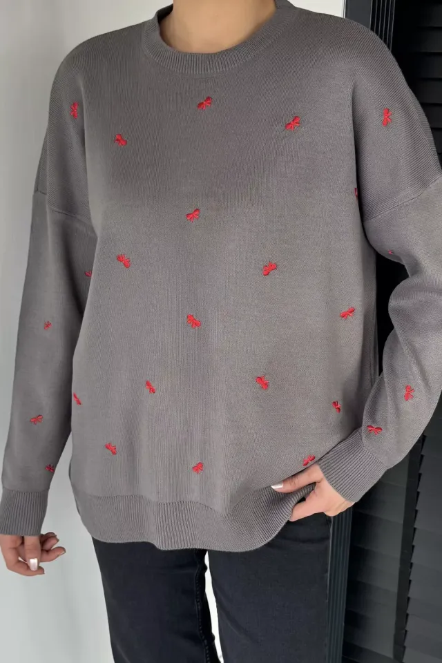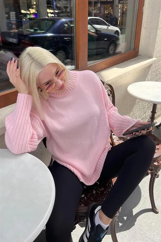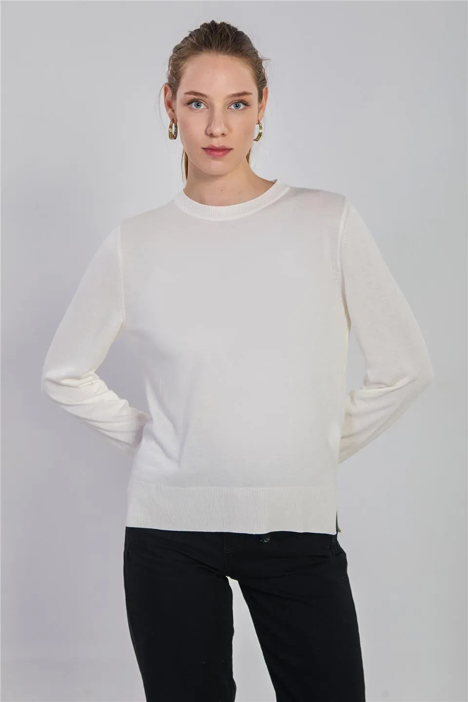 سويتر نسائي محبوك بأكمام طويلة وياقة دائرية، يتميز بملمس ناعم وقصة مريحة مثالية للارتداء اليومي.