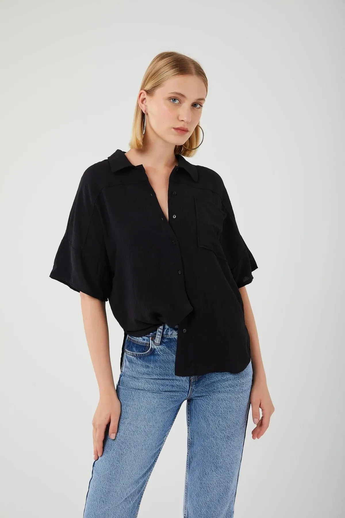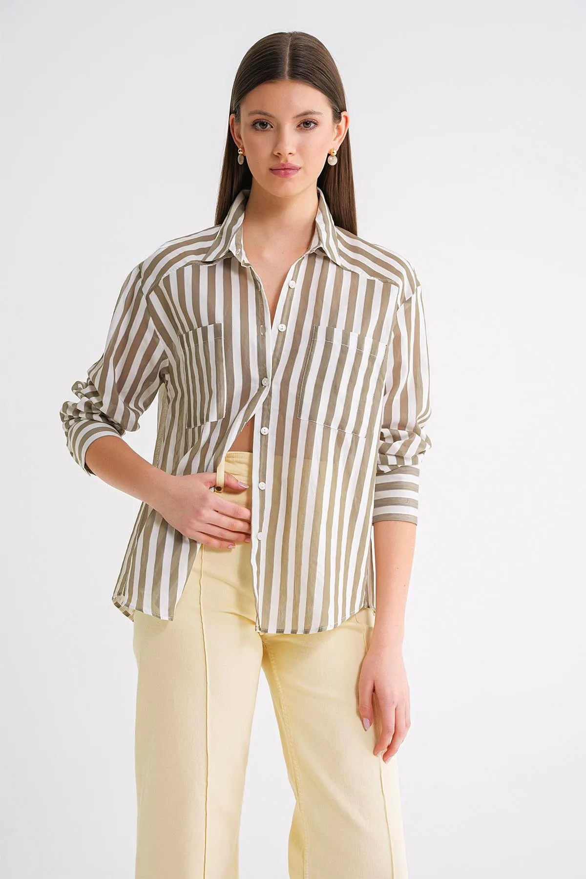 قميص كتان نسائي بتصميم مريح بأكمام طويلة و أزرار أمامية، يتميز بتفاصيل درز مكشوفة لإضفاء لمسة عصرية وأنيقة مثالية للارتداء اليومي.