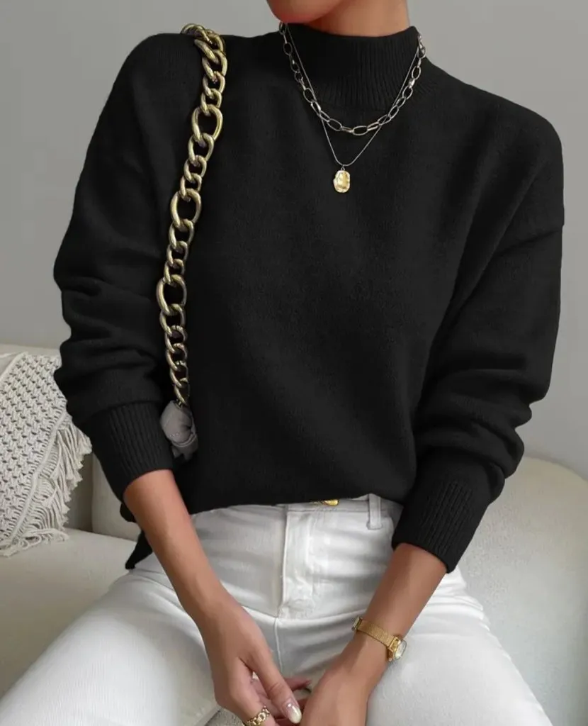 سويتر نسائي محبوك بياقة عالية وأكتاف منخفضة ولمسة مضلعة ناعمة. أنيق ودافئ، مثالي للأيام الباردة.