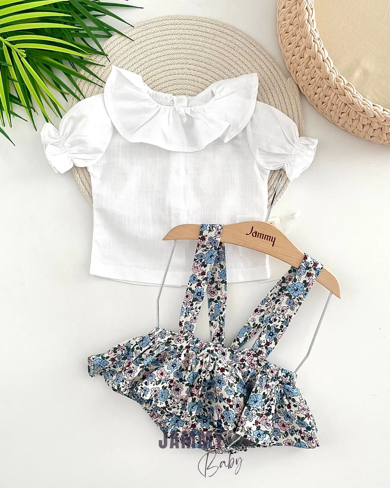 طقم بنات عصري مصنوع من 90% قطن و10% لايكر مع تصميم مطبوع. الجزء العلوي يحتوي على أزرار ضغط للأحجام حتى 2 سنة، وحزام خصر مرن. حجم العينة: 1 سنة. الأبعاد: طول الجزء العلوي 35 سم، عرض 27 سم، طول البنطال 38 سم، محيط الخصر 40 سم. قابل للغسل على درجة 40°C. مناسب لفصول الربيع، الخريف، والشتاء.