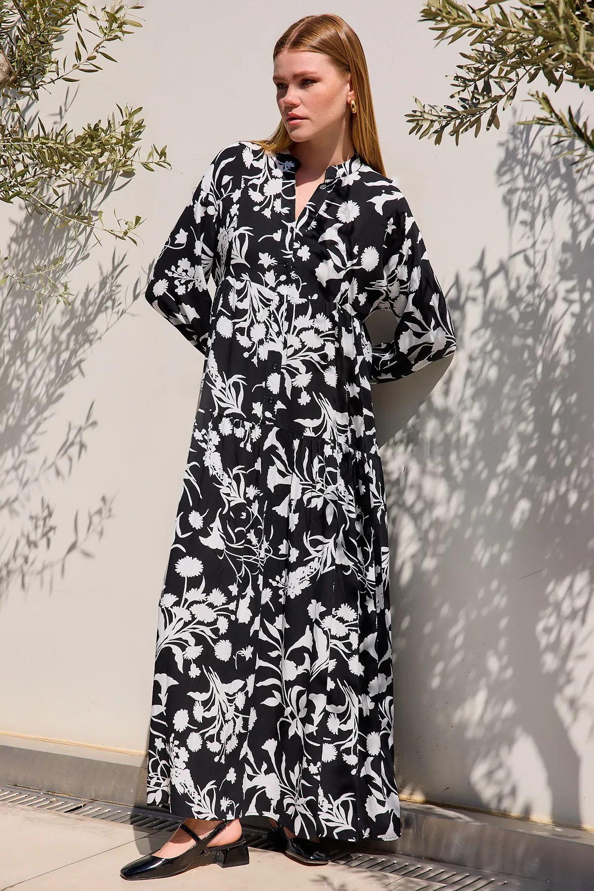 فستان طويل كاجوال منقوش بياقة على شكل V مع أزرار أمامية للنساء - Beyond Store