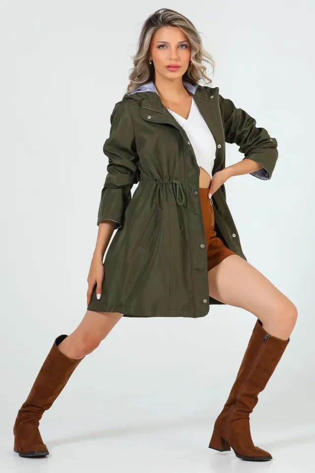 مصنوع من 100% بوليستر، يتميز هذا الترنشكوت المزدوج الصدر المبطن بالأناقة والراحة. الموديل يرتدي المقاس 38، وقياساته: الطول: 176 سم، الصدر: 90 سم، الخصر: 63 سم، الورك: 94 سم. طول المنتج: 96 سم، طول الكم: 52 سم.