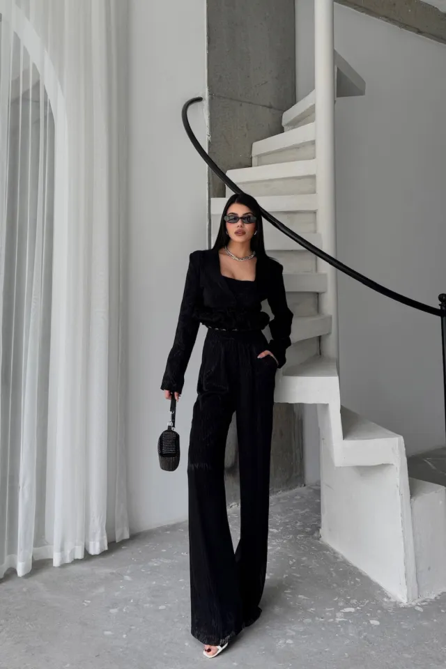طقم بنطلون بأرجل واسعة من الاسفل وصدرية بأزرار أمامية للنساء
