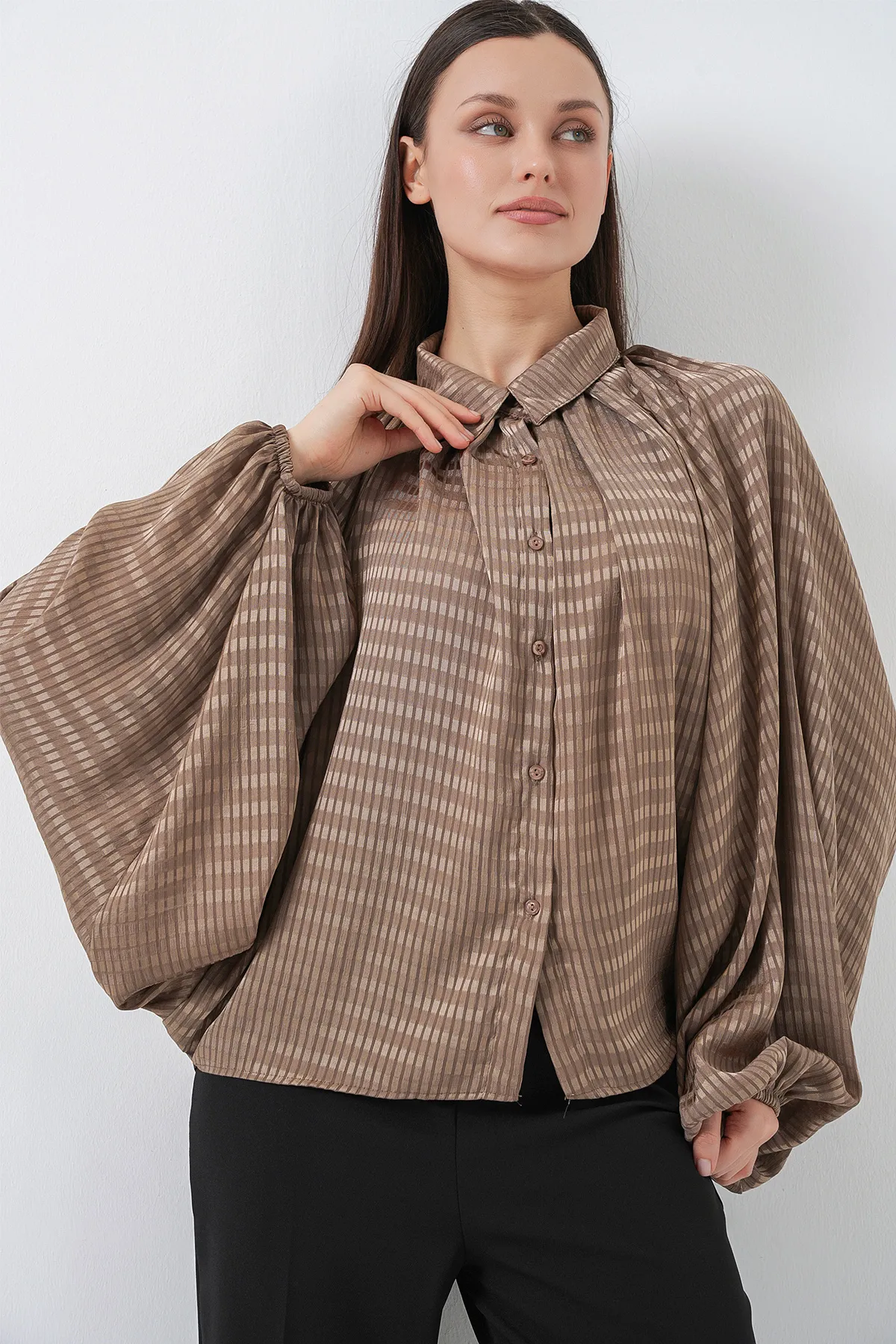 محتوى المنتج %84 فيسكوز %16 نايلون مميزات المنتج قميص طويل مكشكش معلومات الموديل المقاس: 38 طول المنتج: 82 سم طول الكم: 58 سم قياس الموديل: الارتفاع: 176 الصدر: 90 الخصر: 63 الورك: 94 تعليمات الغسيل والاستخدام العامة • يجب غسل المنتجات المصنوعة يدويًا والمطرزة بالخرز من الداخل للخارج في برنامج غسيل رقيق • قد تتساقط المنتجات المطبوعة بمرور الوقت • لا تتجاوز 30 درجة مئوية