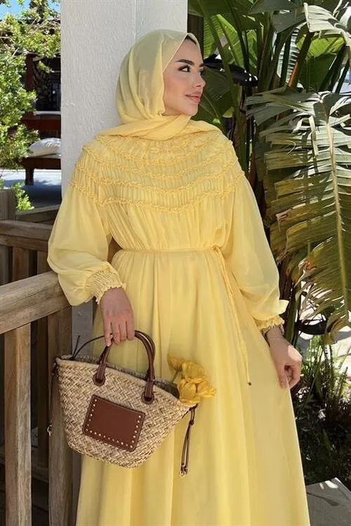 فستان ماكسي أنيق بأكمام طويلة وياقة دائرية وتصميم أنيق مطوي. مزين بتفاصيل فتحات رقيقة وأربطة معصم لإطلالة كاجوال.